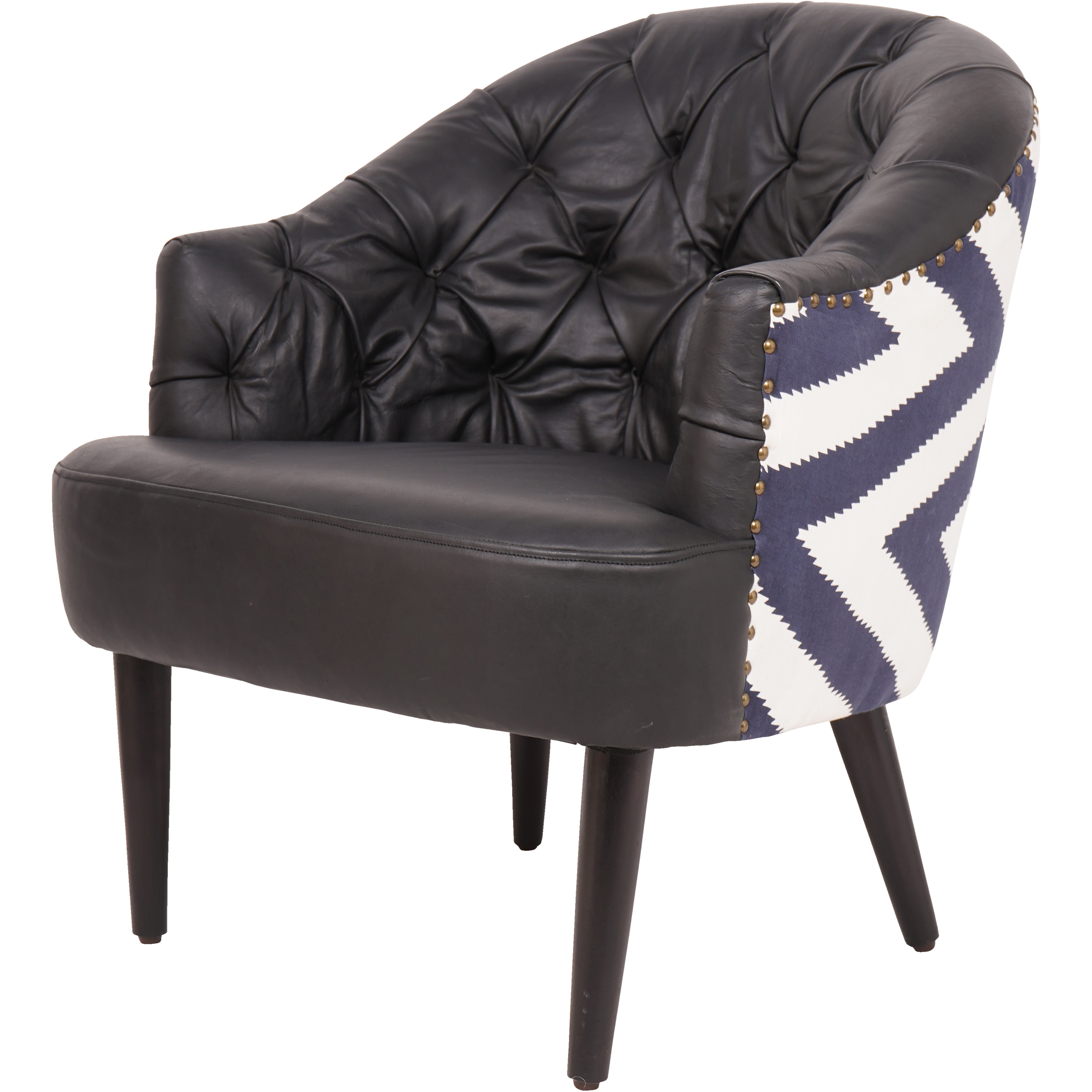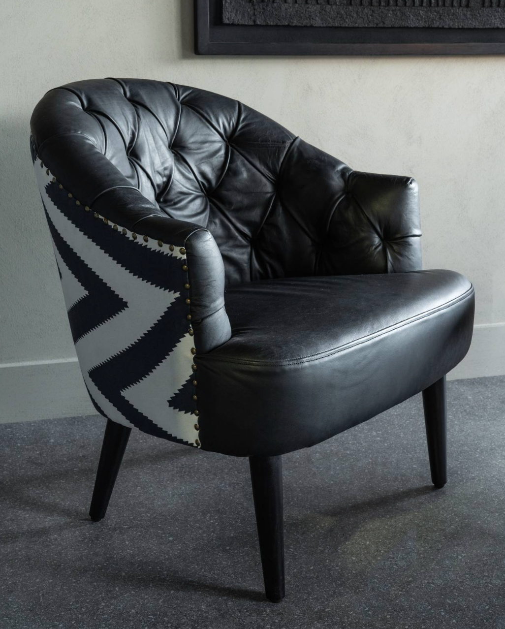 Introduce the ultimate addition to any bedroom or lounge with the Addison Occasional Chair. Its black leather interior offers unparalleled comfort while the exterior's striking Zigzag navy blue and white print creates a captivating contrast. Featuring a solid wooden frame, black wooden legs, and nail detailing, this chair is both versatile and stylish.