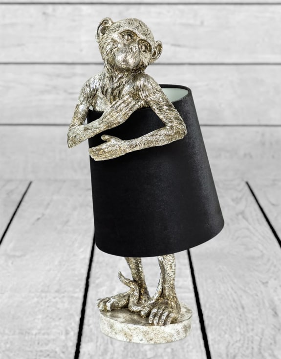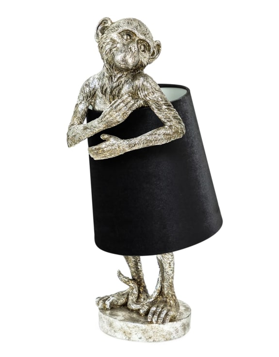 An antique gold look bashful monkey table lamp with a blue velvet shade.