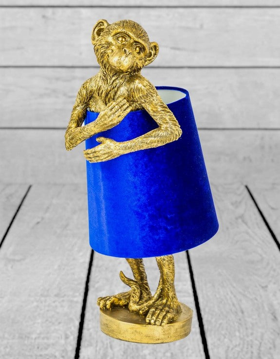 Antique Gold Bashful Monkey Table lamp with Blue Velvet Shade