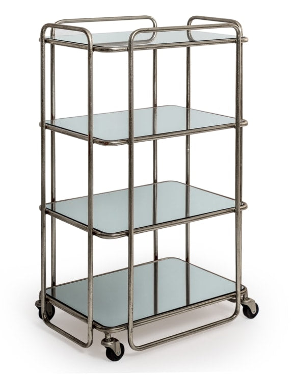 Antiqued Silver Leaf Metal Bar Trolley with Mirror Shelves