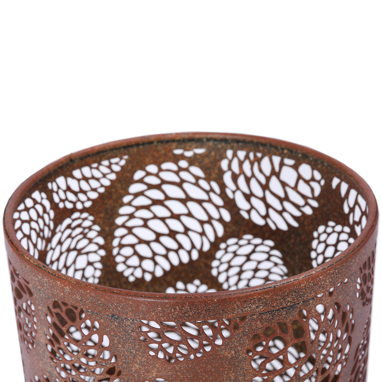 Bring a warm woodland glow to your interior with the Laura Ashley Iron Cut-out Pinecone Hurricane. Crafted from iron with a rustic bronze-effect finish, this charming design features delicate pinecone cut-outs that cast soft, flickering shadows when lit. Transform your space into a cosy retreat with this elegant accent.