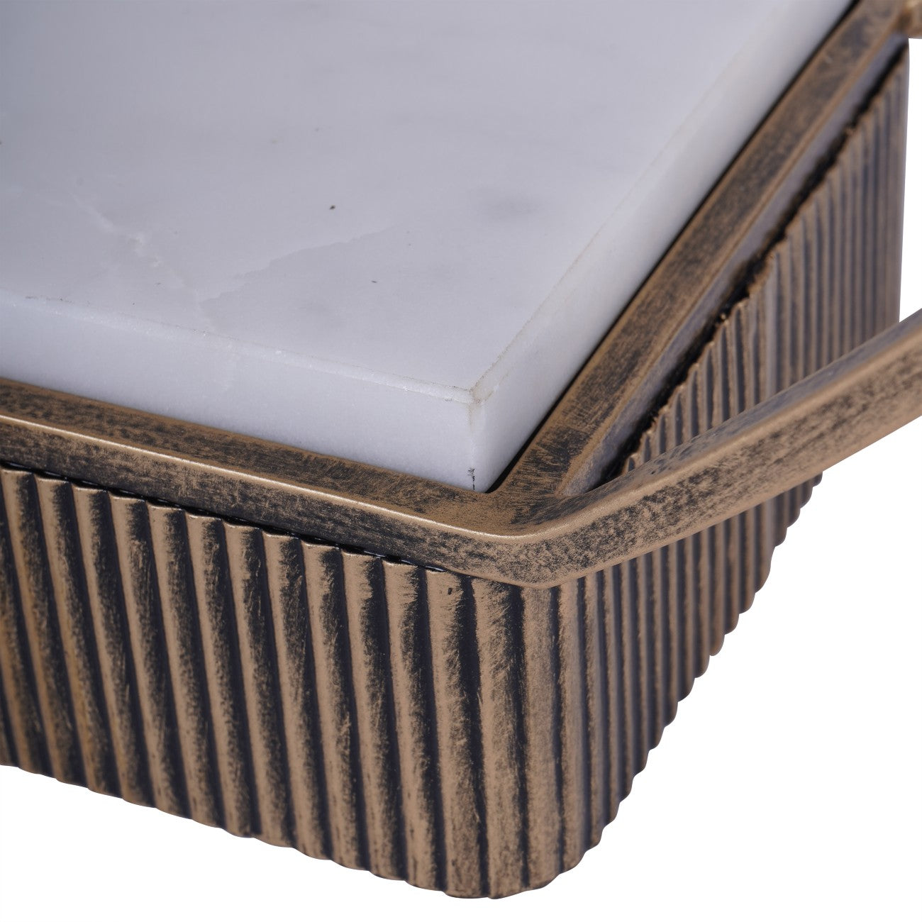 The Belgravia Aged Gold Multi-Tier Buffet Stand with white Banswara marble sits on the iconic corrugated Belgravia corrugated base, which works in both traditional and modern interiors, effortlessly fitting into a dining room or chic entertaining space. Each tier is thoughtfully designed to hold a variety of items, from food to décor. Whether serving delicate pastries or canapés, its graceful presence blends seamlessly with any décor. As part of this collection, there is also a single-tier and a two-tier buffet stand.