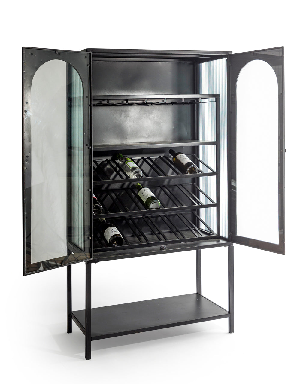 Organise and display your wine collection with the sleek and elegant Black and Antique Gold "Orwell" Wine Storage Cabinet. This 2 door cabinet features glass holders and shelves for easy access to your favourite bottles, while the external bottom shelf provides additional storage space. The glass sides and doors add a touch of sophistication to the black metal frame with gold trim.