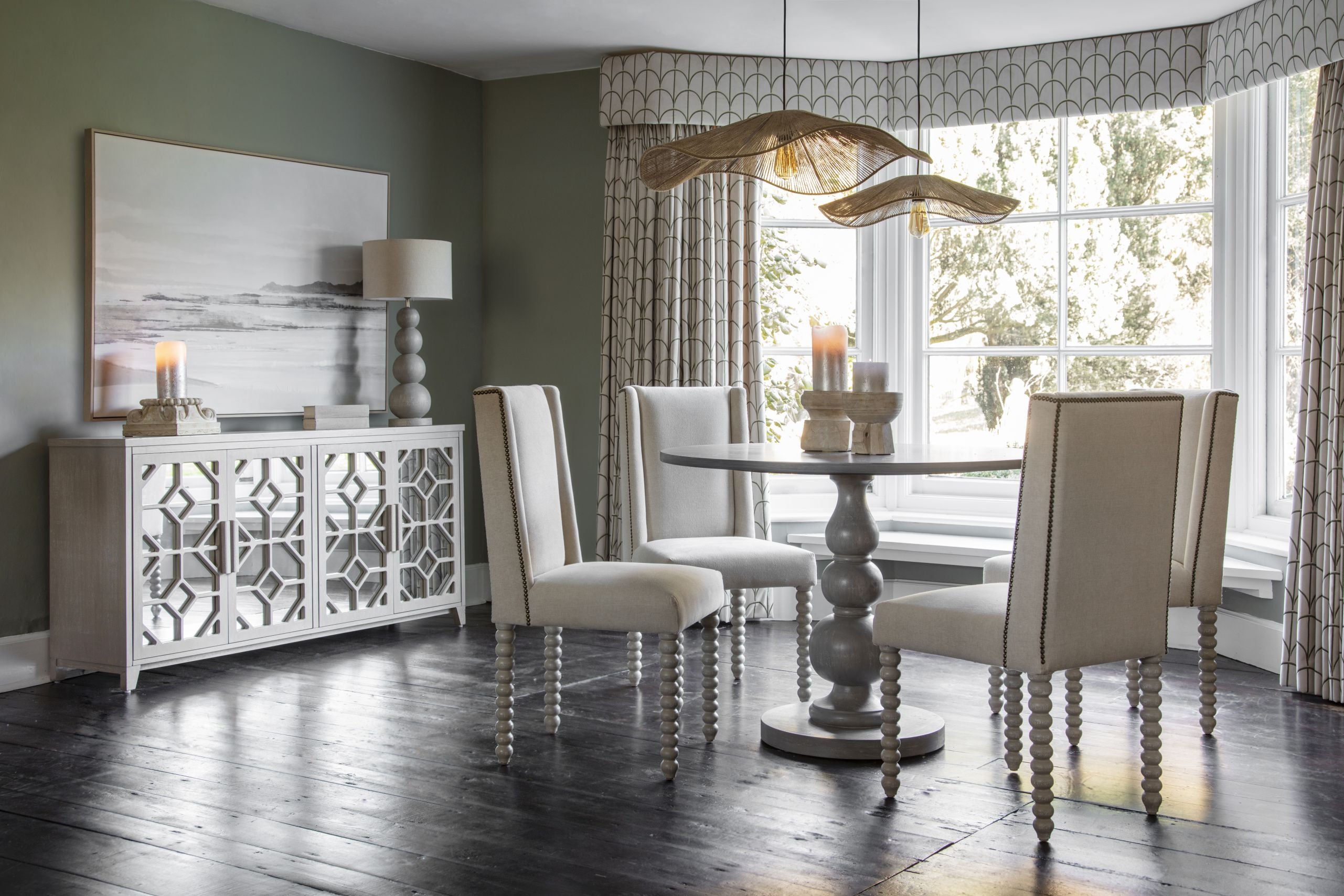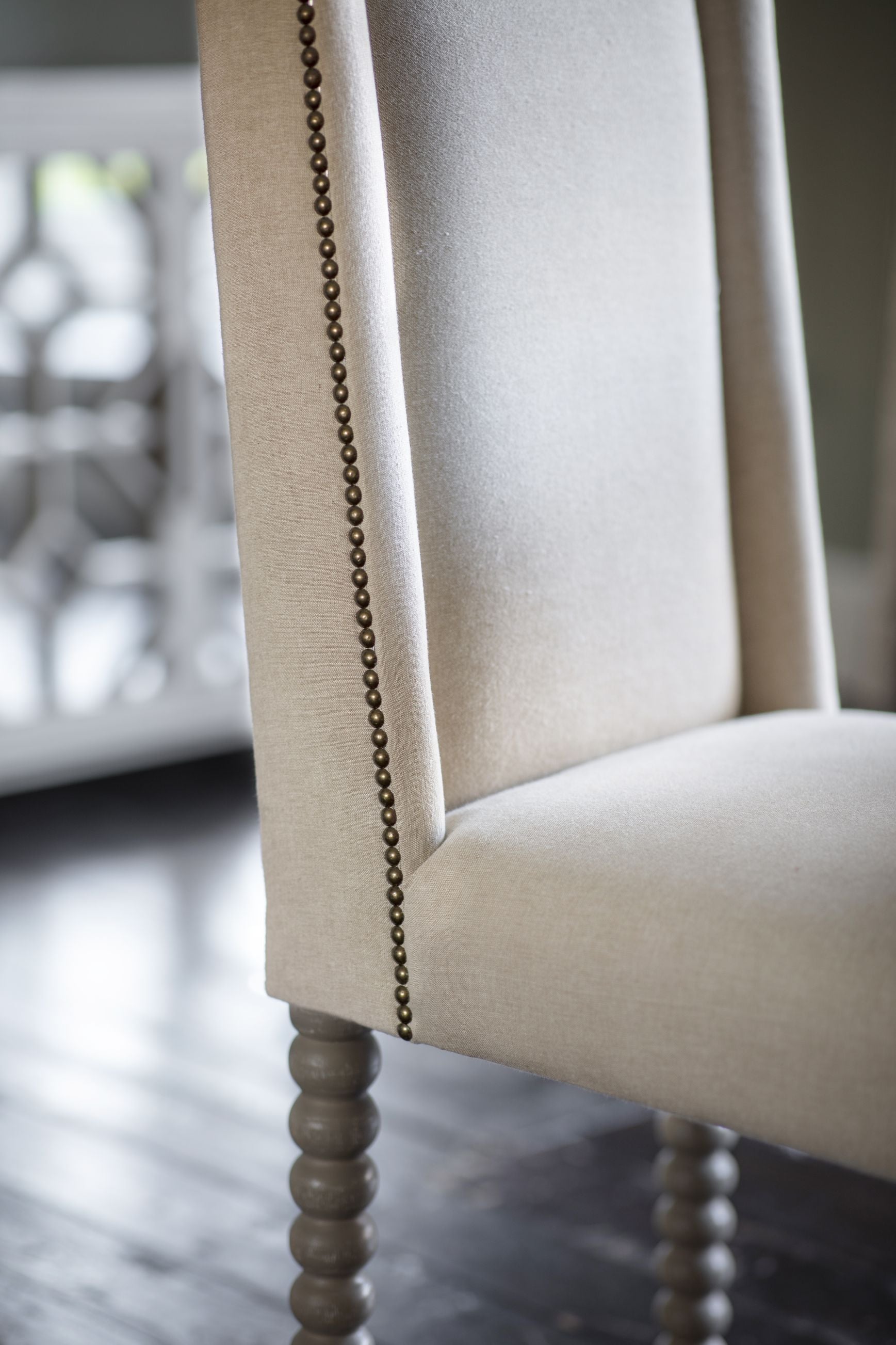 Introducing the Buckley Upholstered Dining Chair in Ivory. Featuring hand-carved bobble legs and neutral cotton upholstery, this classic piece adds a touch of elegance to any dining space. Pair with the matching table or use as an occasional chair. Expertly crafted with a washed finish for a timeless look.
