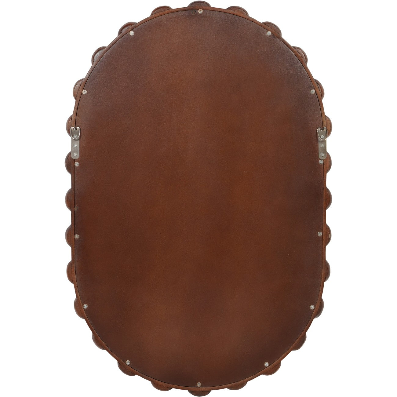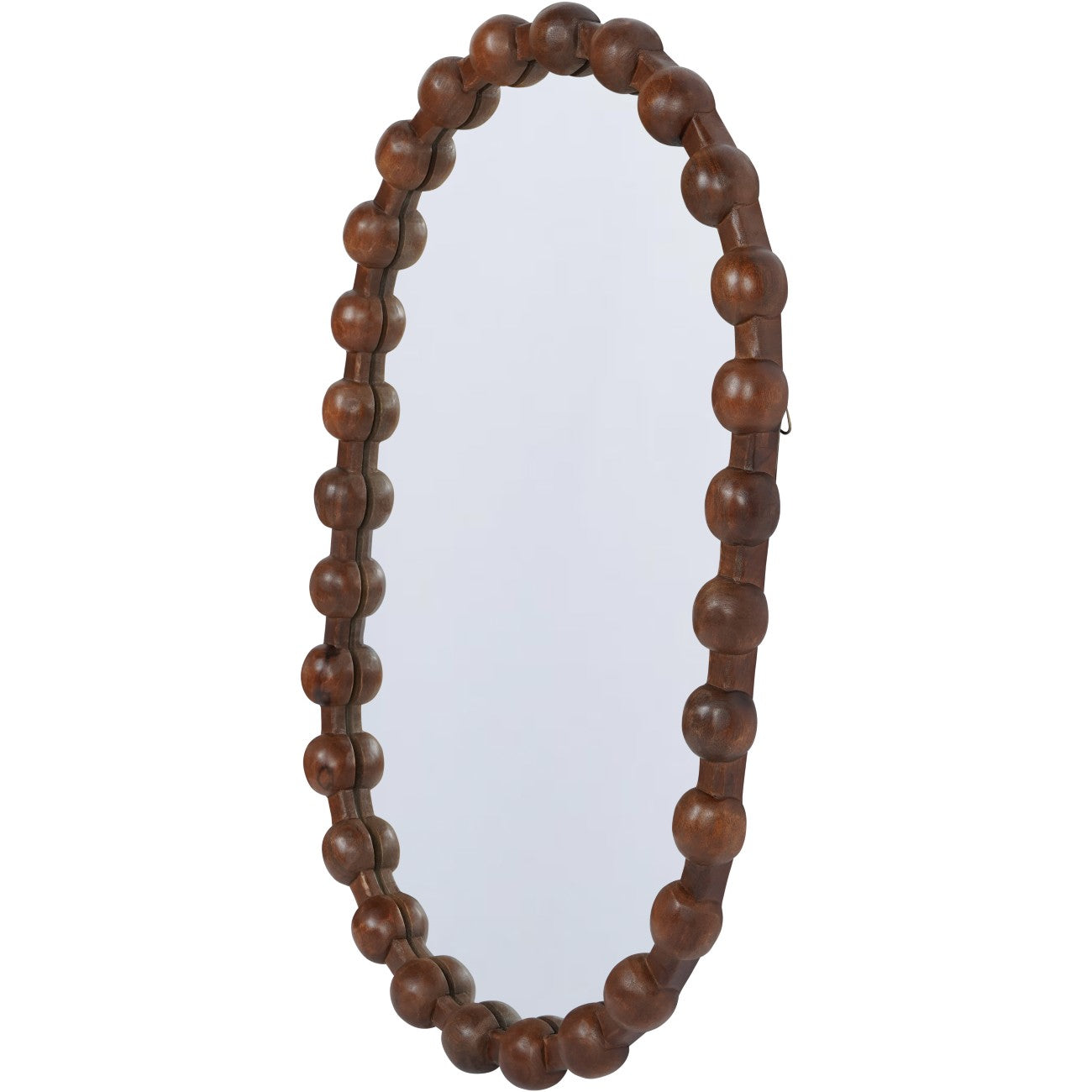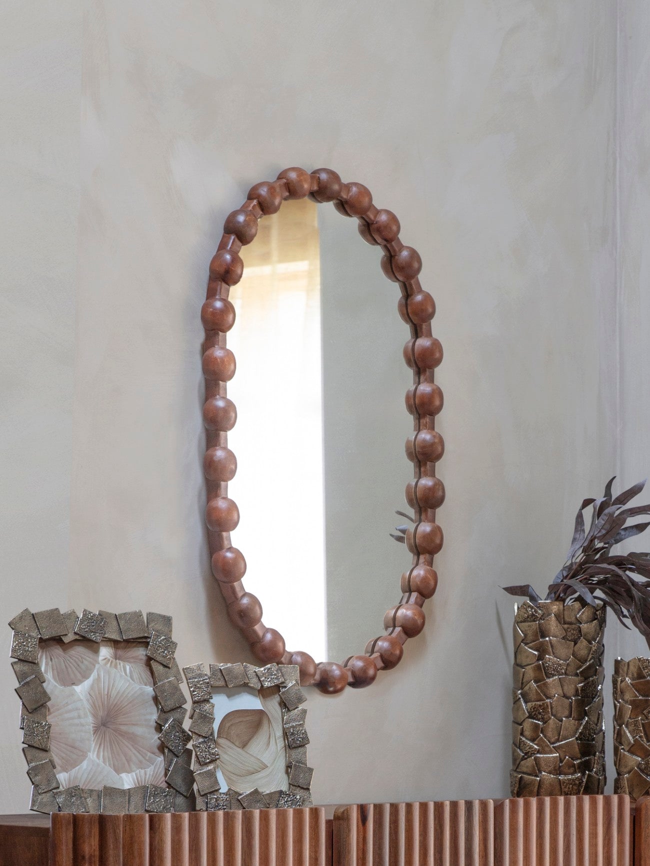 Transform your space into a sophisticated haven with the Carter Oval Carved Wooden Mirror. Its oval shape and intricate bobble detailing add a touch of art deco elegance, making it the perfect statement piece. Made of solid wood, this mirror exudes luxury and refinement. Crafted from solid mango wood with a dark stain finish, it showcases the natural beauty and subtle grain of the wood. Mirror can be hung in portrait elevation only.