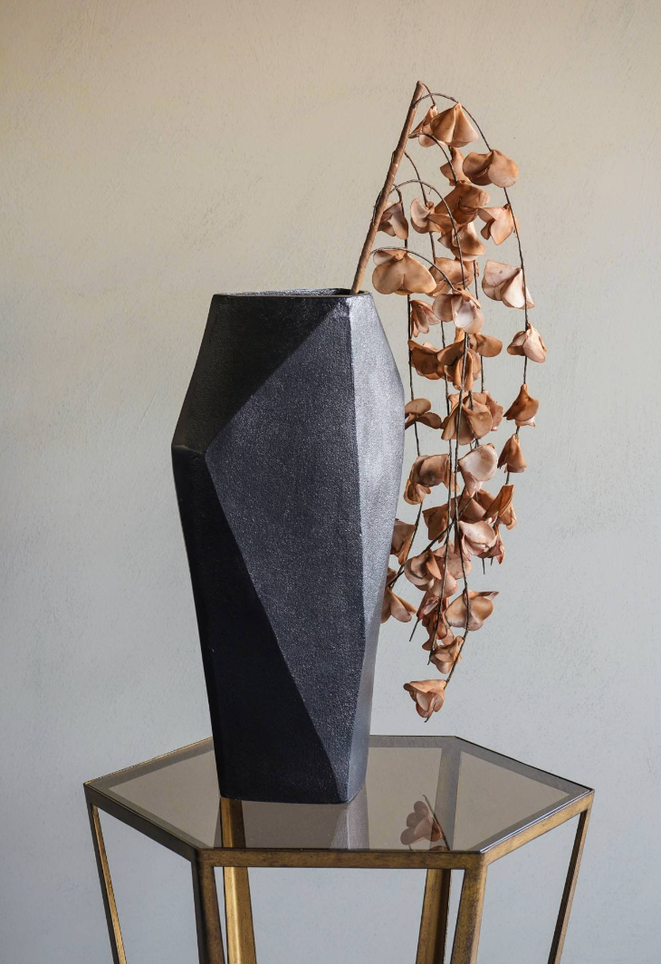 Add a touch of elegance to your home with this Cast Aluminium Faceted Charcoal Black Vase. Its intricate faceted design and beautiful charcoal matt finish on aluminium create a statement piece. Part of a wider collection, perfect for decorative use. Please note, this is not recommended for holding water.