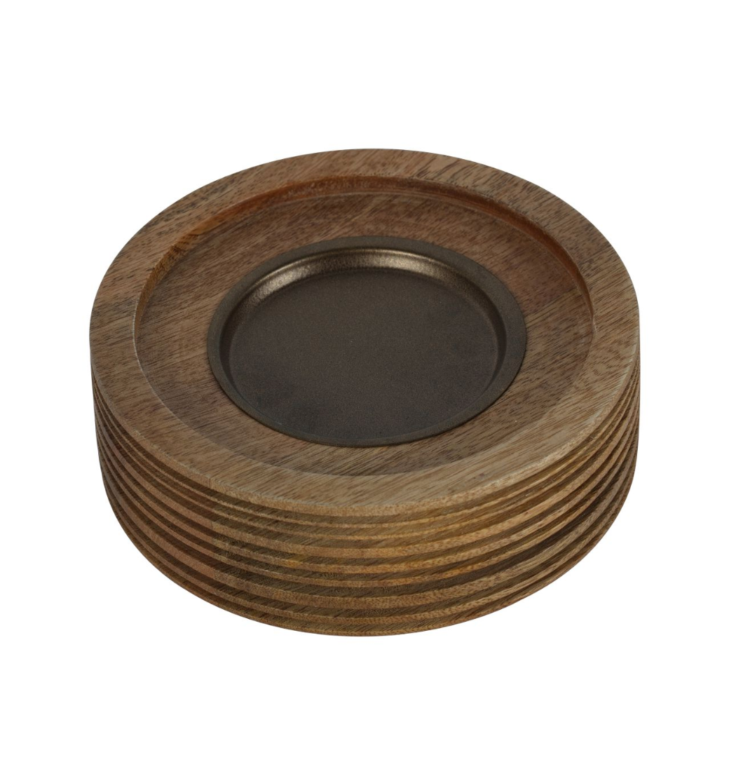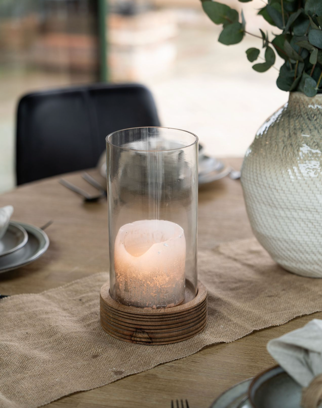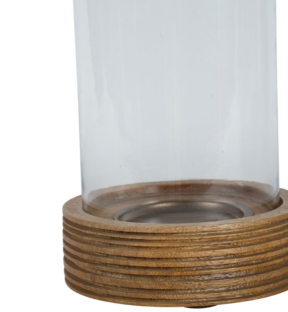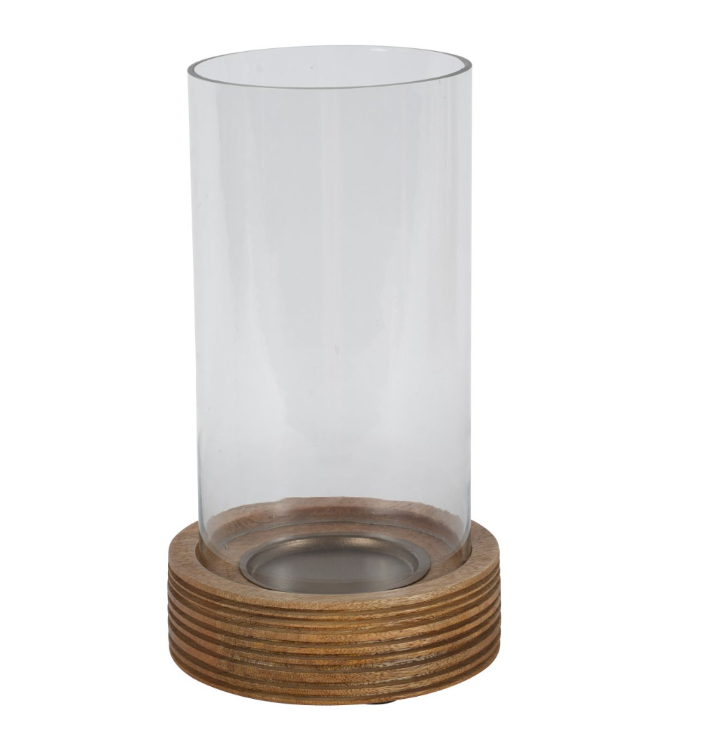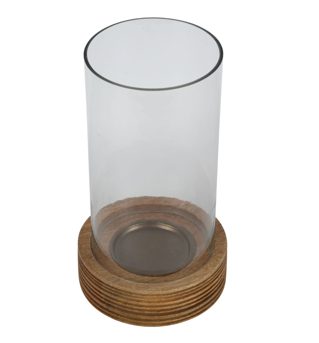 Add a touch of natural elegance to any room with our Glass & Wood Hurricane Candle Holder. This sleek, clear glass cylinder rests on a distinctive wooden base with sculpted, layered ridges for texture. The stacked, grooved design of the base adds depth, perfectly complementing the smooth glass.