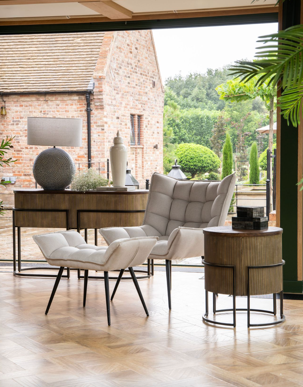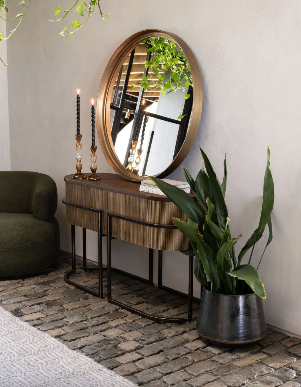 Elevate your interior design with our Harrison Antique Gold Corrugated Console Table. This unique piece from our Harrison furniture collection offers a blend of traditional and contemporary styles, featuring solid wood stained tops and elegant antique gold bases. Versatile storage trunks and occasional tables provide flexibility to suit your needs.
