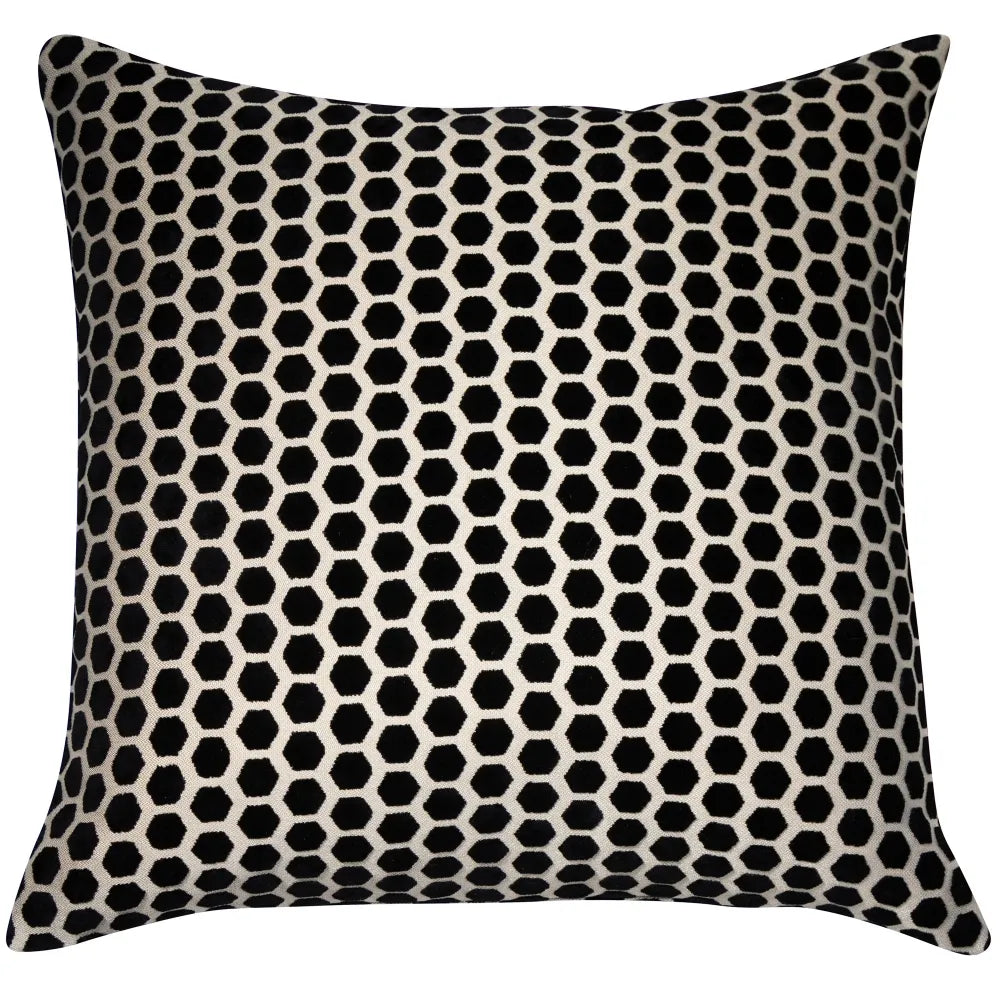 Add a touch of elegance to your home with our Jorvik Black Cushion. The textured cut velvet and bold geometric hexagonal pattern in black on a light background will elevate any space. Experience luxurious comfort and style with this statement piece.