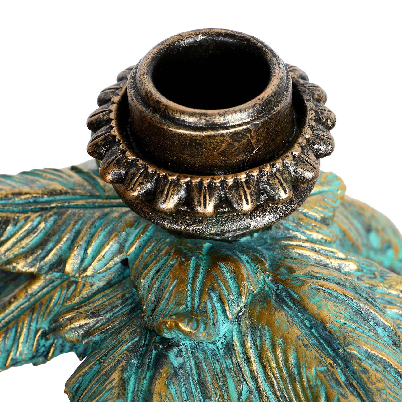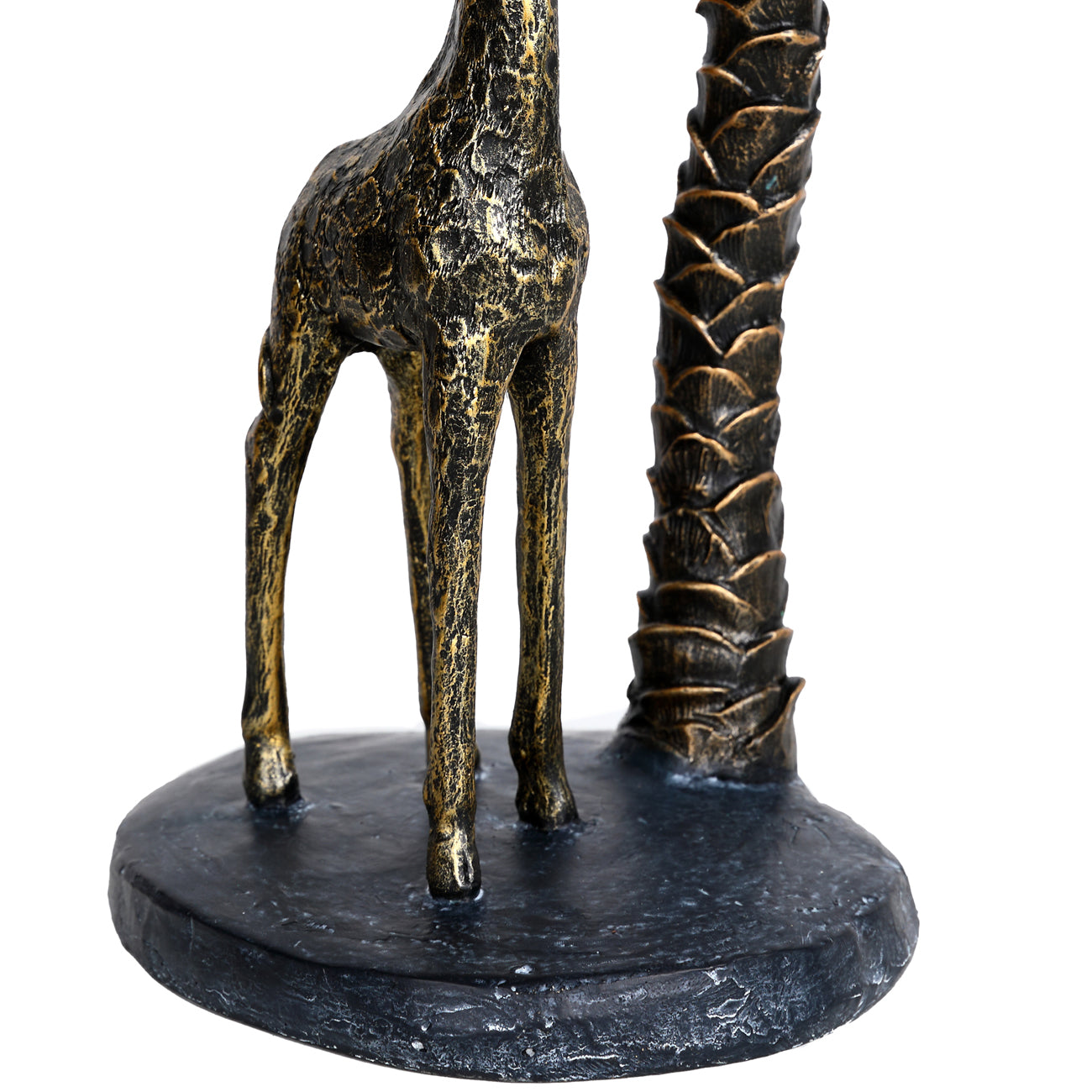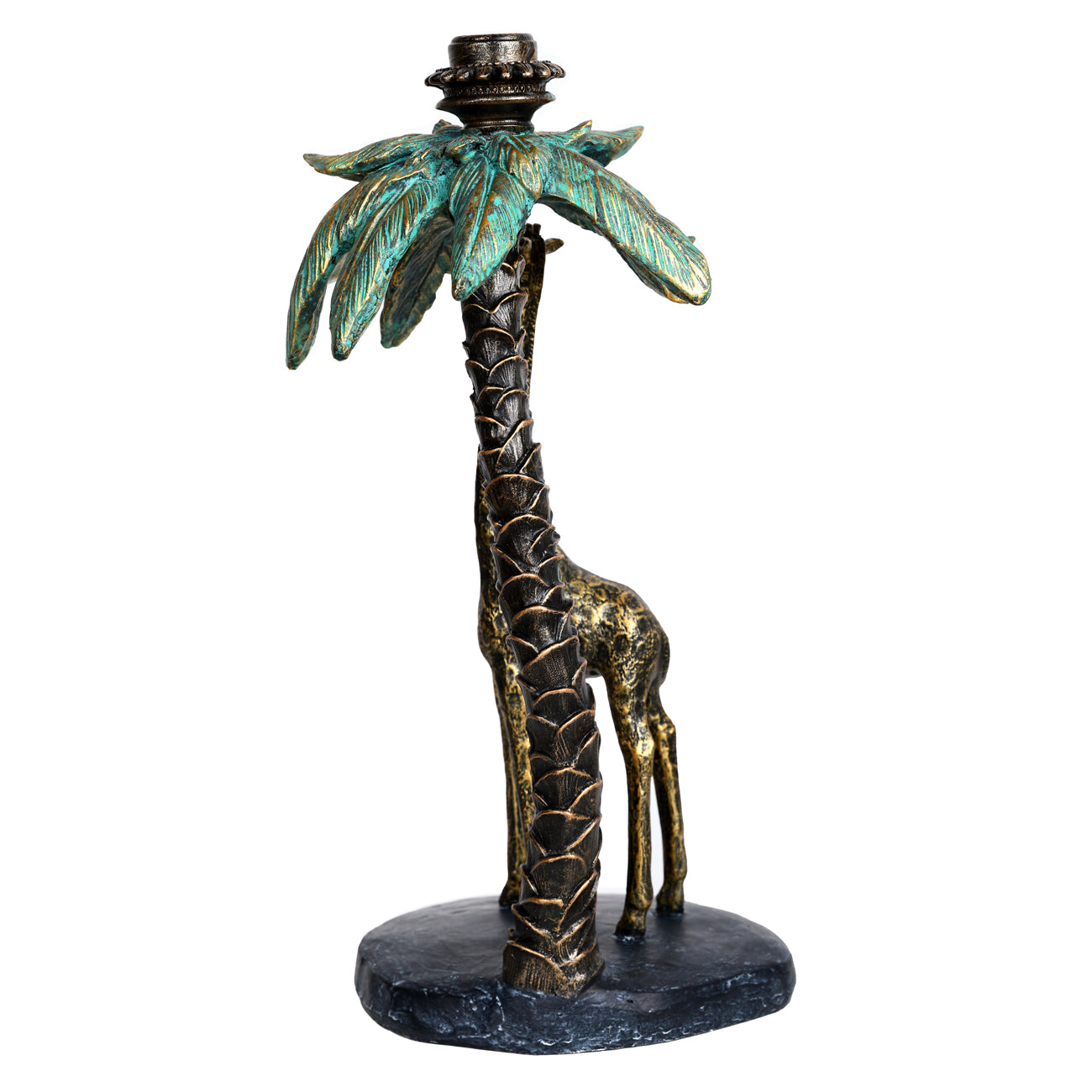 Elevate your decor with the Jungle Palm Giraffe Candle Stick, featuring a tall, slender giraffe reaching toward stylized palm fronds that cradle a single taper candle. Its antique gold finish with verdigris washes and hand-finished textures bring warmth and depth to the piece. Perfect as a standalone sculptural accent or combined with the matching elephant and leopard designs, this candle stick adds elegant height and a touch of natural curiosity to any room.