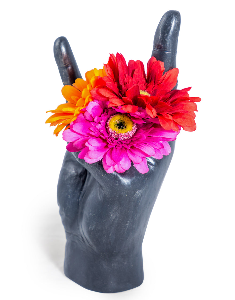 Add a touch of rock and roll to your home decor with our Large Black 'Rock on!' Hand Ornament. This quirky piece is sure to be a conversation starter and will bring some playful personality to any room. Perfect for any music lover or free spirit.