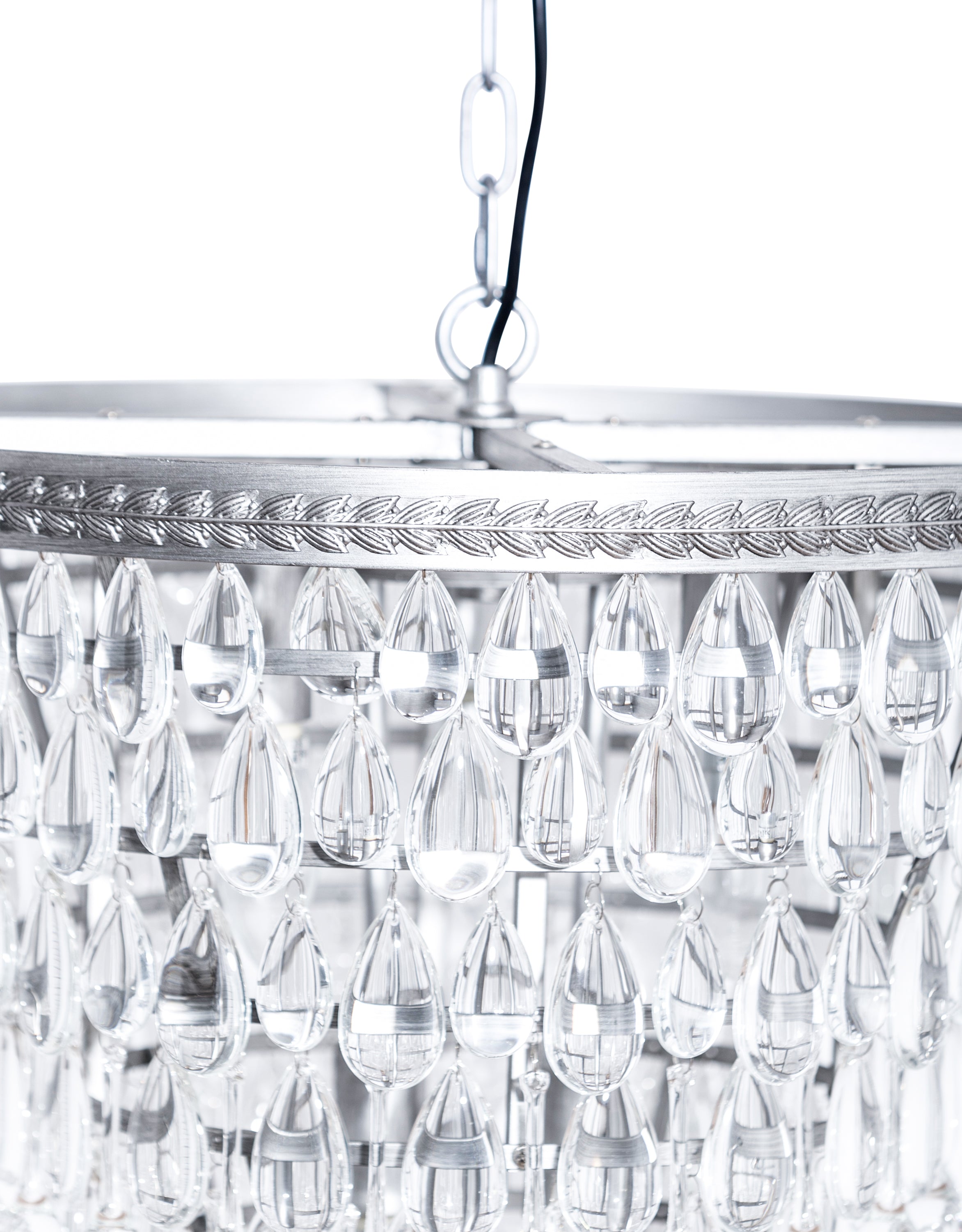 Expertly designed with a stunning large brushed silver finish, this rainfall chandelier is the perfect addition to any modern living space. Crafted with clear crystals and a decorative silver base, it effortlessly adds a touch of elegance and luxury to any room. Upgrade your home's lighting with this must-have chandelier.