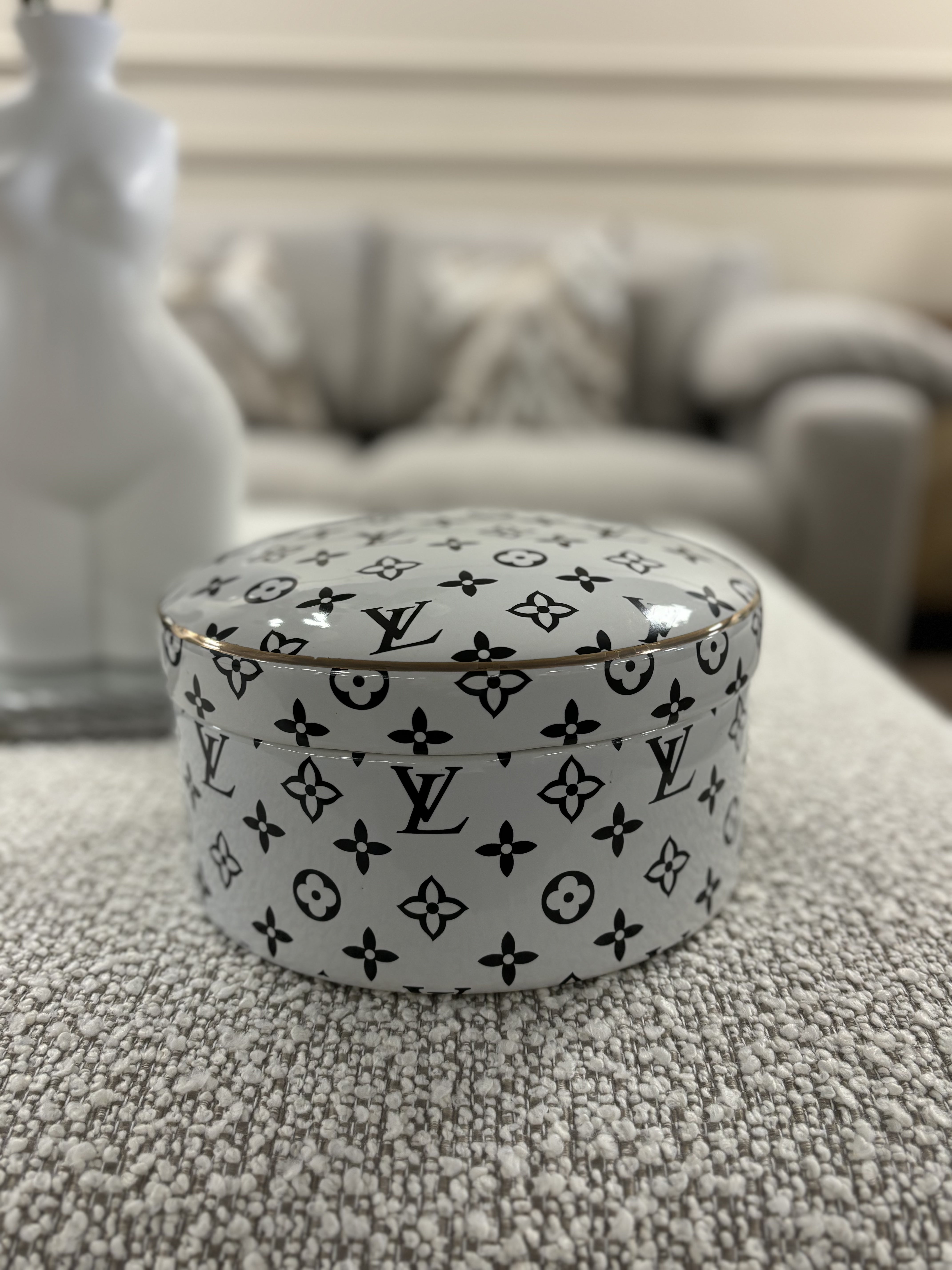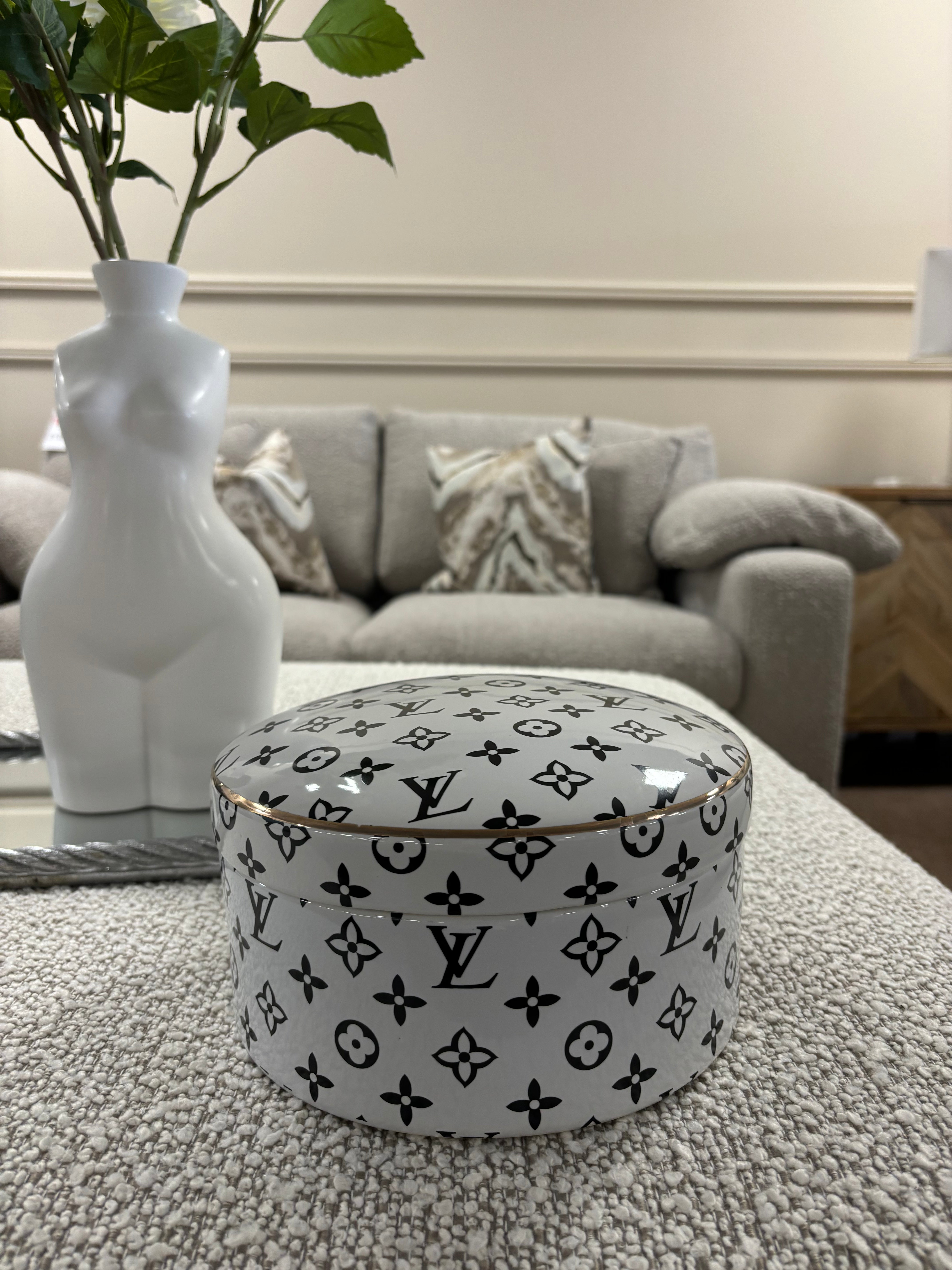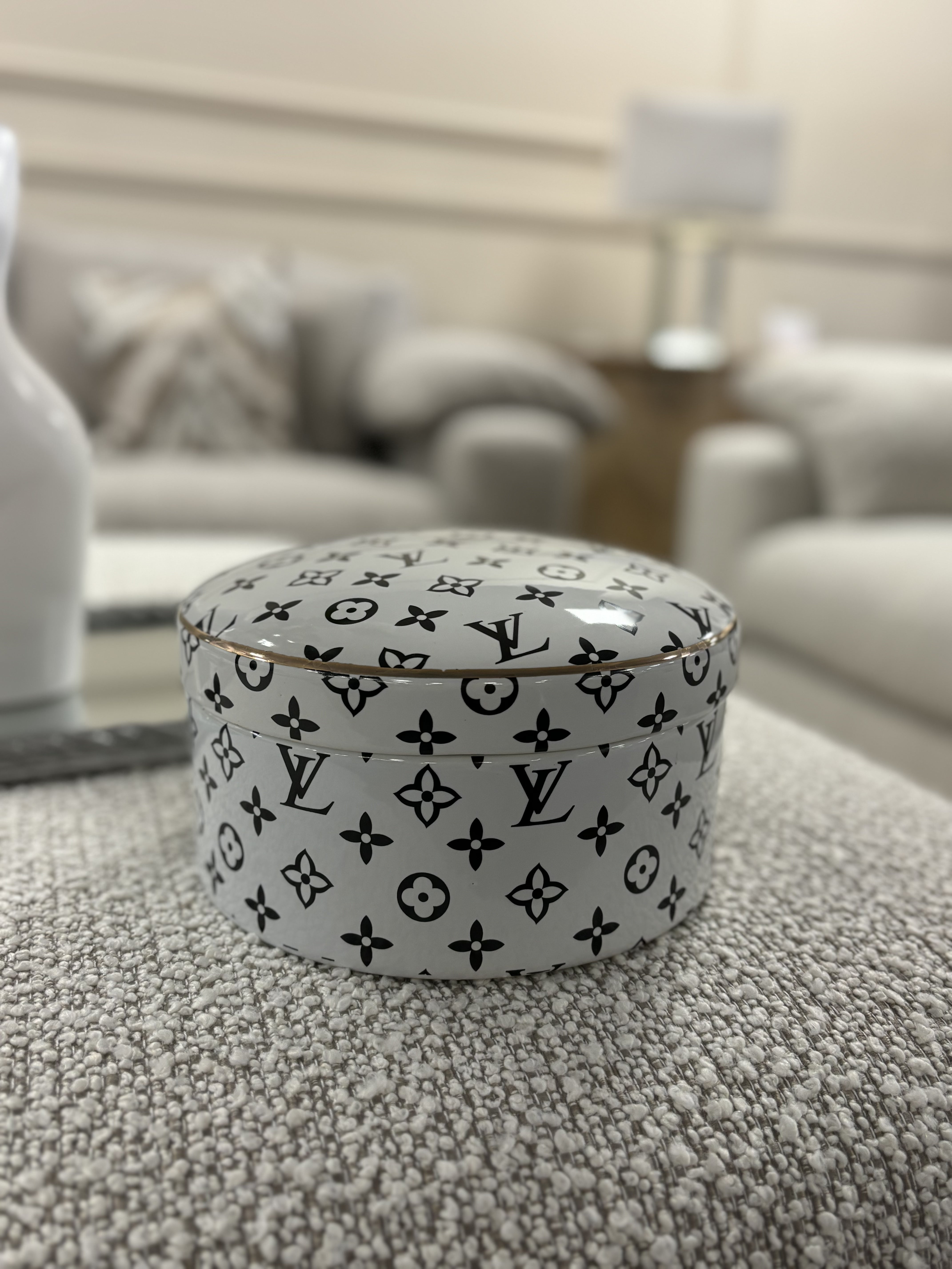 Elevate your home decor with our Large LV Designer Inspired Trinket Dish. This elegantly designed storage dish features a classic Designer Inspired logo print and a lid, making it perfect for storing your favourite treasures or displaying as a decorative statement. Durable and luxurious, this dish adds a touch of sophistication to any space.