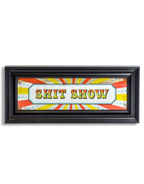Transform your space with our Large Mirrored 'Shit Show' Wall Sign. With a sleek black frame and bold red and yellow circus pattern, this statement piece brings a touch of playful chaos to any room. Reflect your sense of humour and style with this one-of-a-kind sign.
