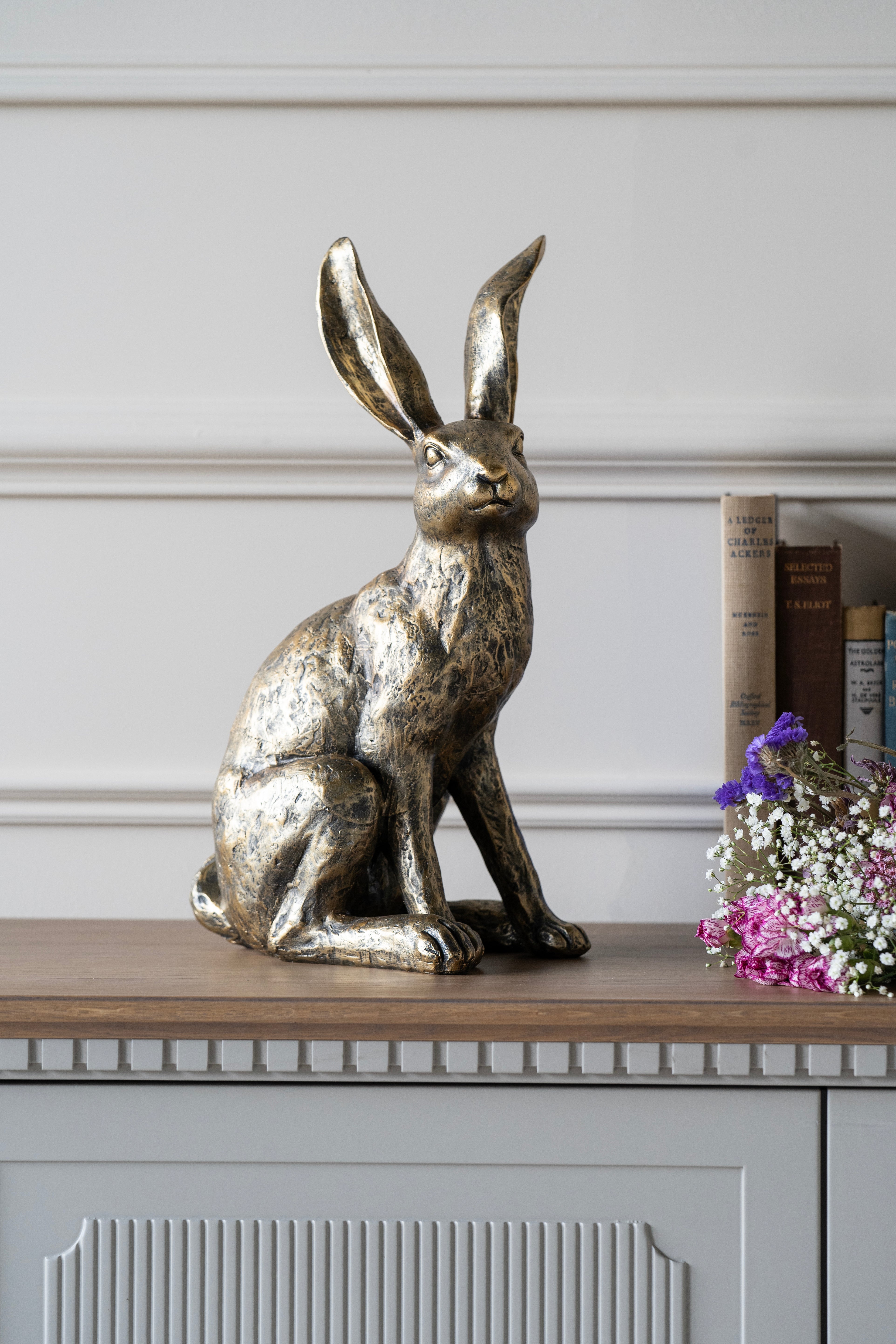 Introducing Laura Ashley's exquisite Antiqued Large Sitting Hare Sculpture. Meticulously crafted in resin and hand finished with a unique antique gold wash, each piece is truly one-of-a-kind. This premium collection captures the charm of a Hare, making it a must-have for any discerning art collector. Available in other sizes for a complete set.