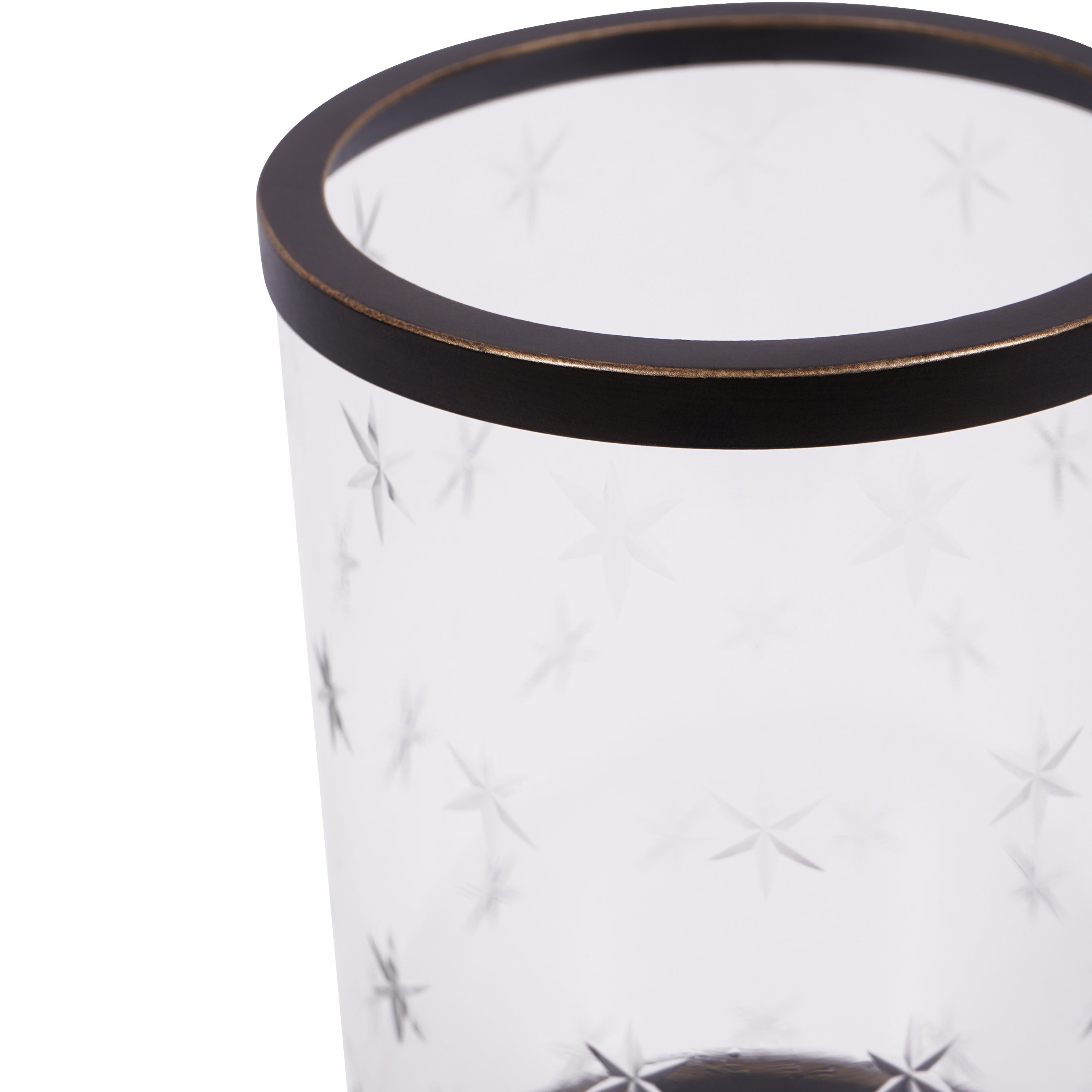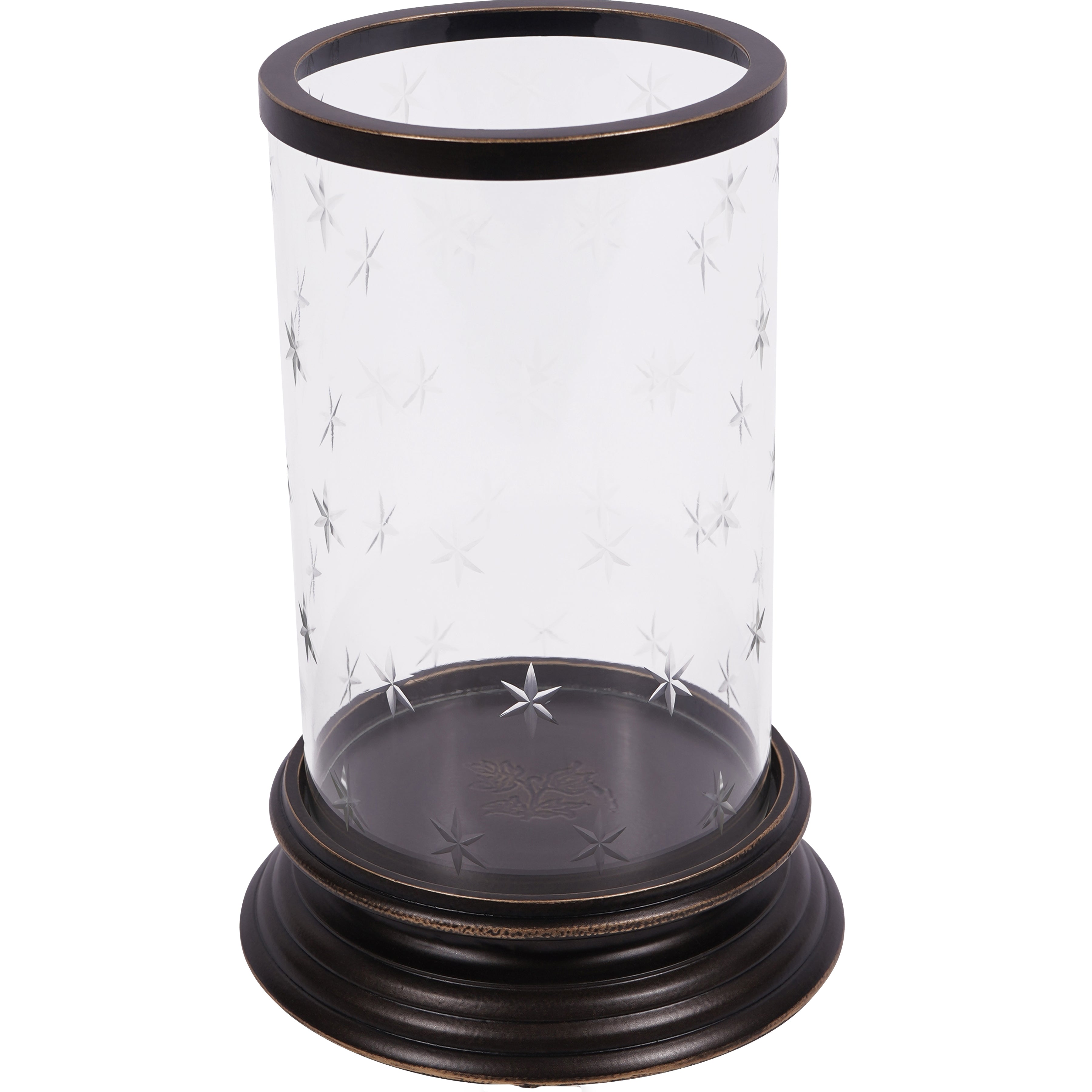 Timeless candle hurricane lantern featuring dark bronze base and rim with gold highlighting and a glass drum flute decorated with hand cut stars. Decorative stars are handcut so natural variations in size and shape will occur. Will add style and elegance to any room. Available in three sizes.