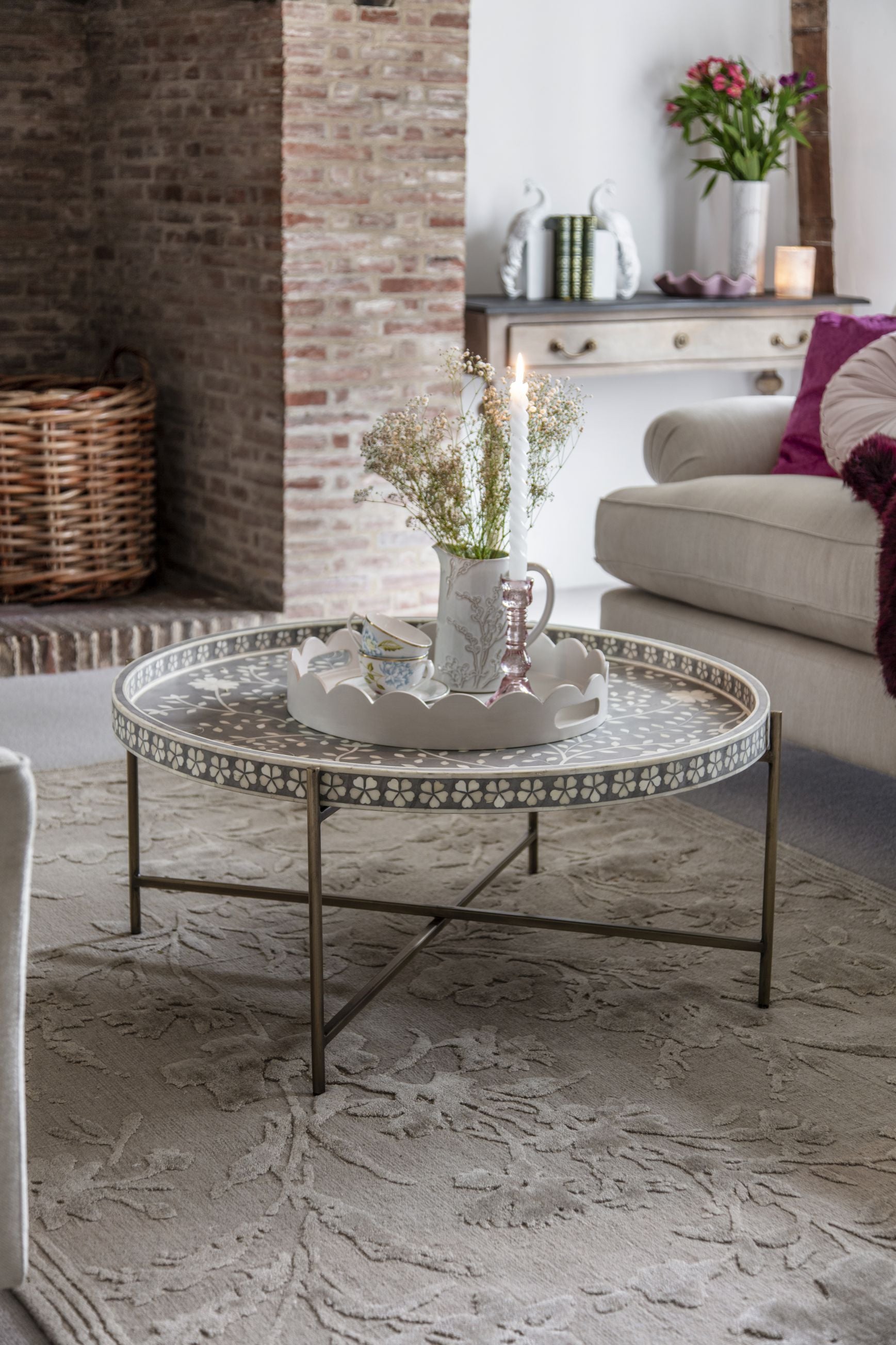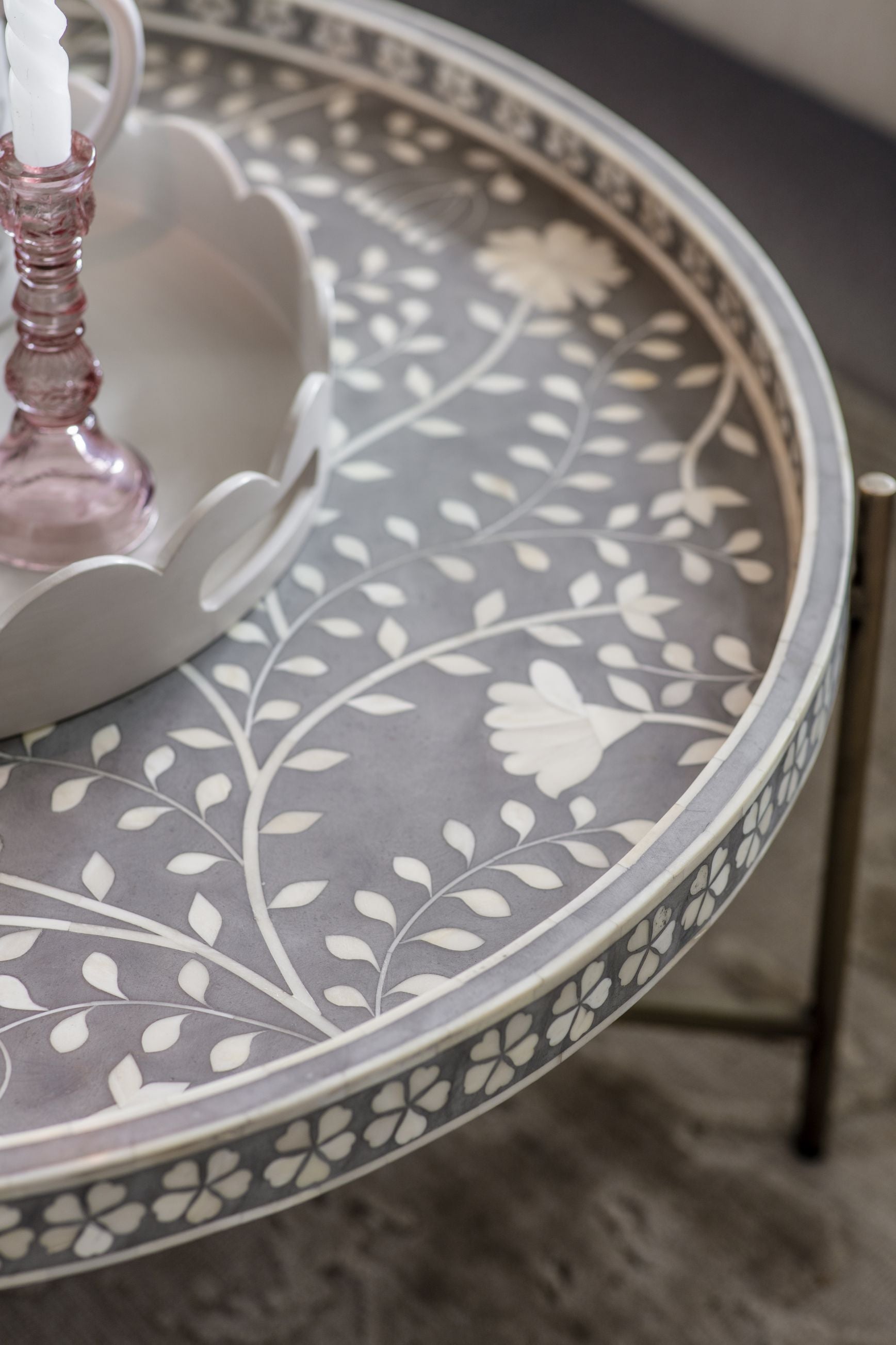 The Espley Bone Inlay Side Table features Laura Ashley’s iconic Roseate design hand crafted using tiny segments of bone each hand cut and placed into position before being bonded to the table surface using a resin compound. This technique is an ancient Indian tradition and the bone is a bi-product of the food industry. Every segment has its own unique colour and natural variations in compound colour should also be expected.