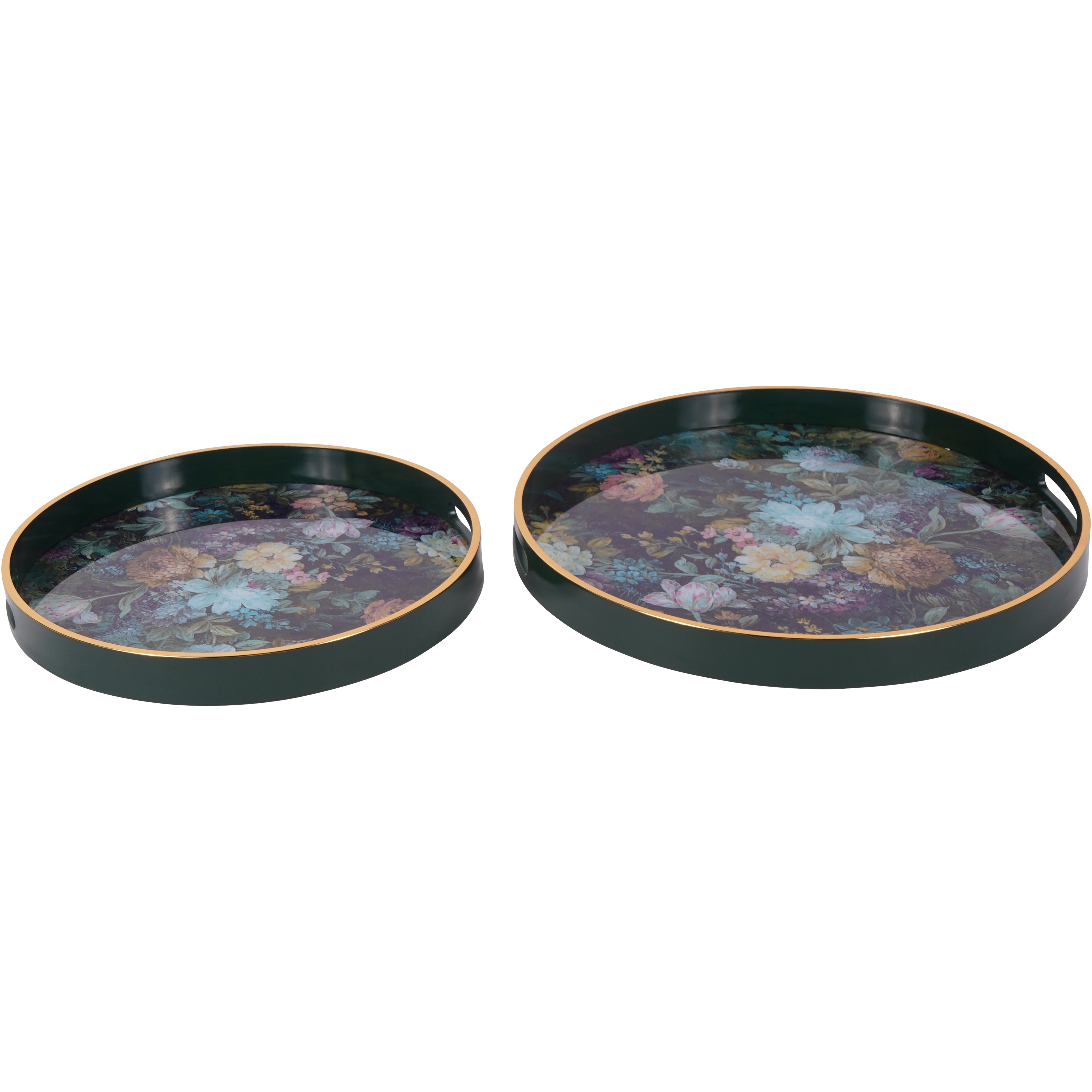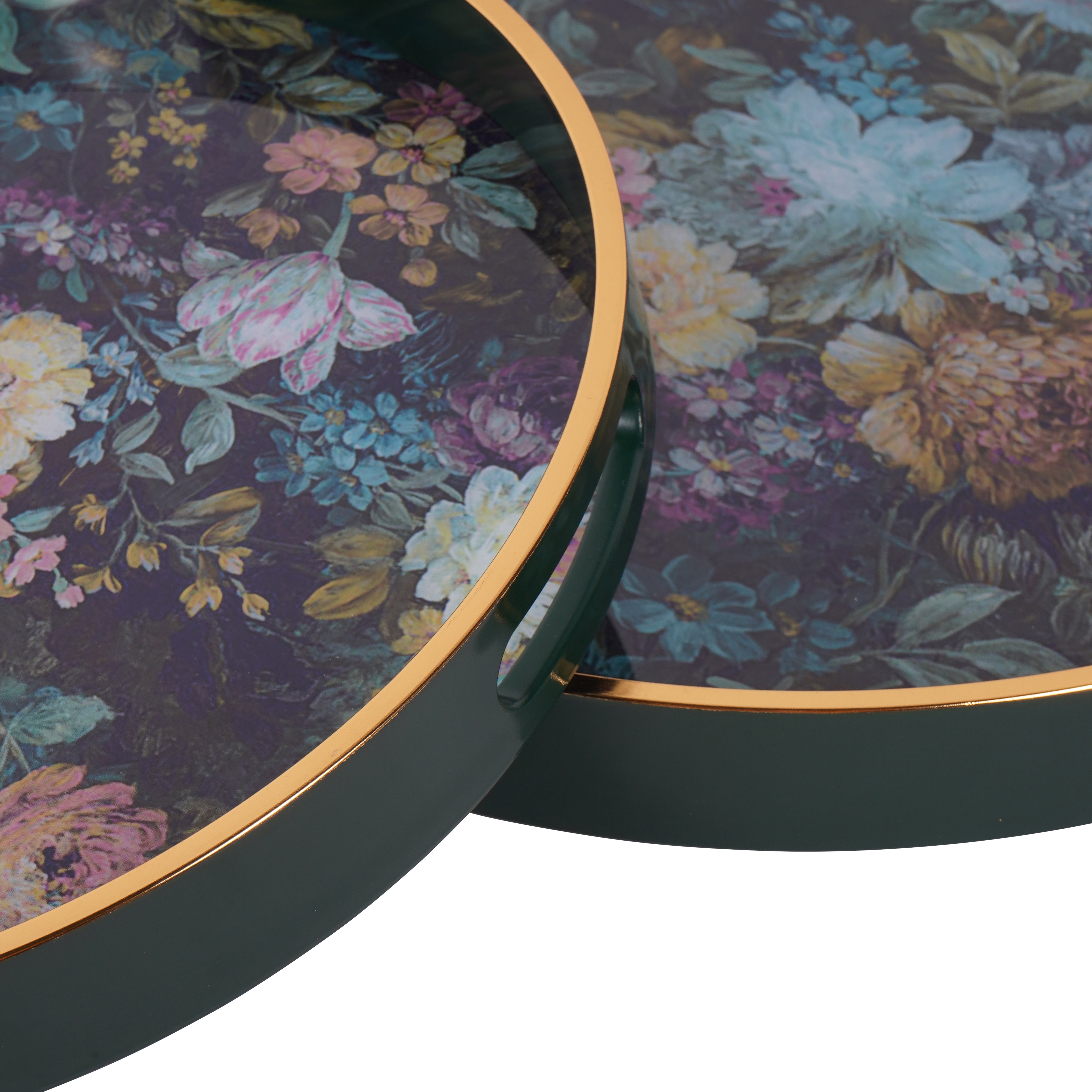 Elevate your home decor with the Laura Ashley Mathilde Print Set of 2 Trays. The famous floral design, set against a rich green background with gold detailing on the tray edges, adds a touch of sophistication to any space. Use them as a stylish serving option or mix and match with the coordinating collection for a complete and elegant look.