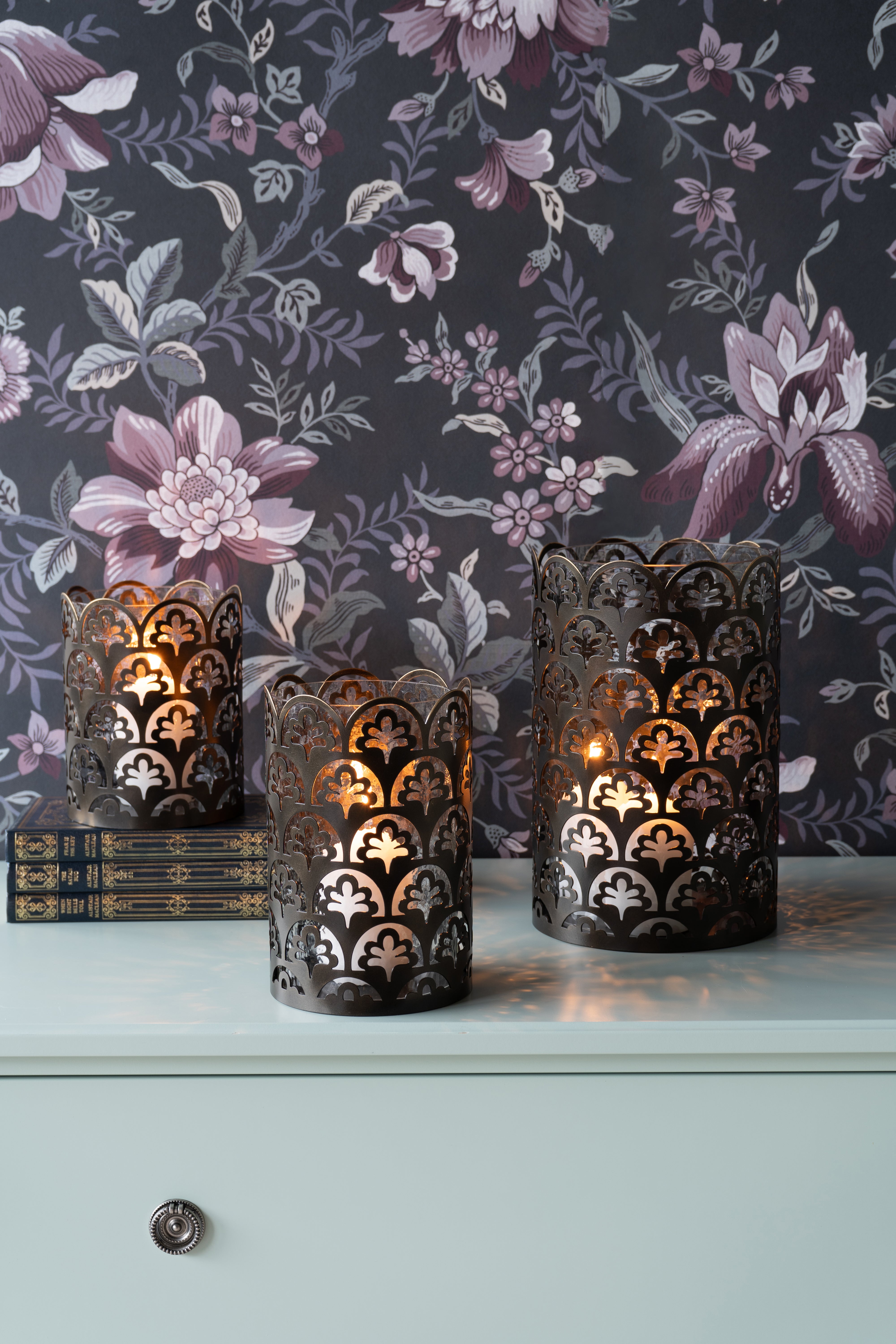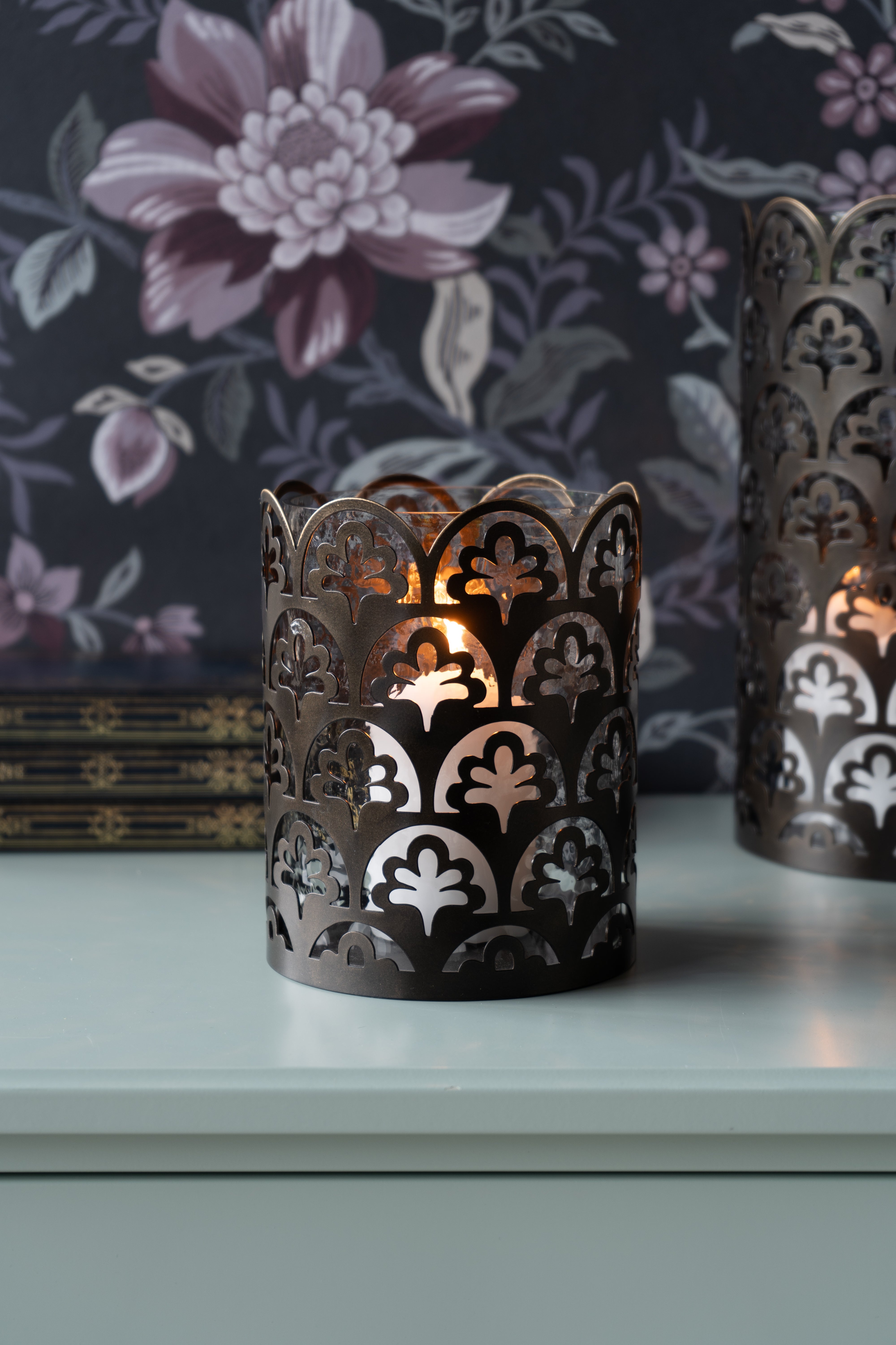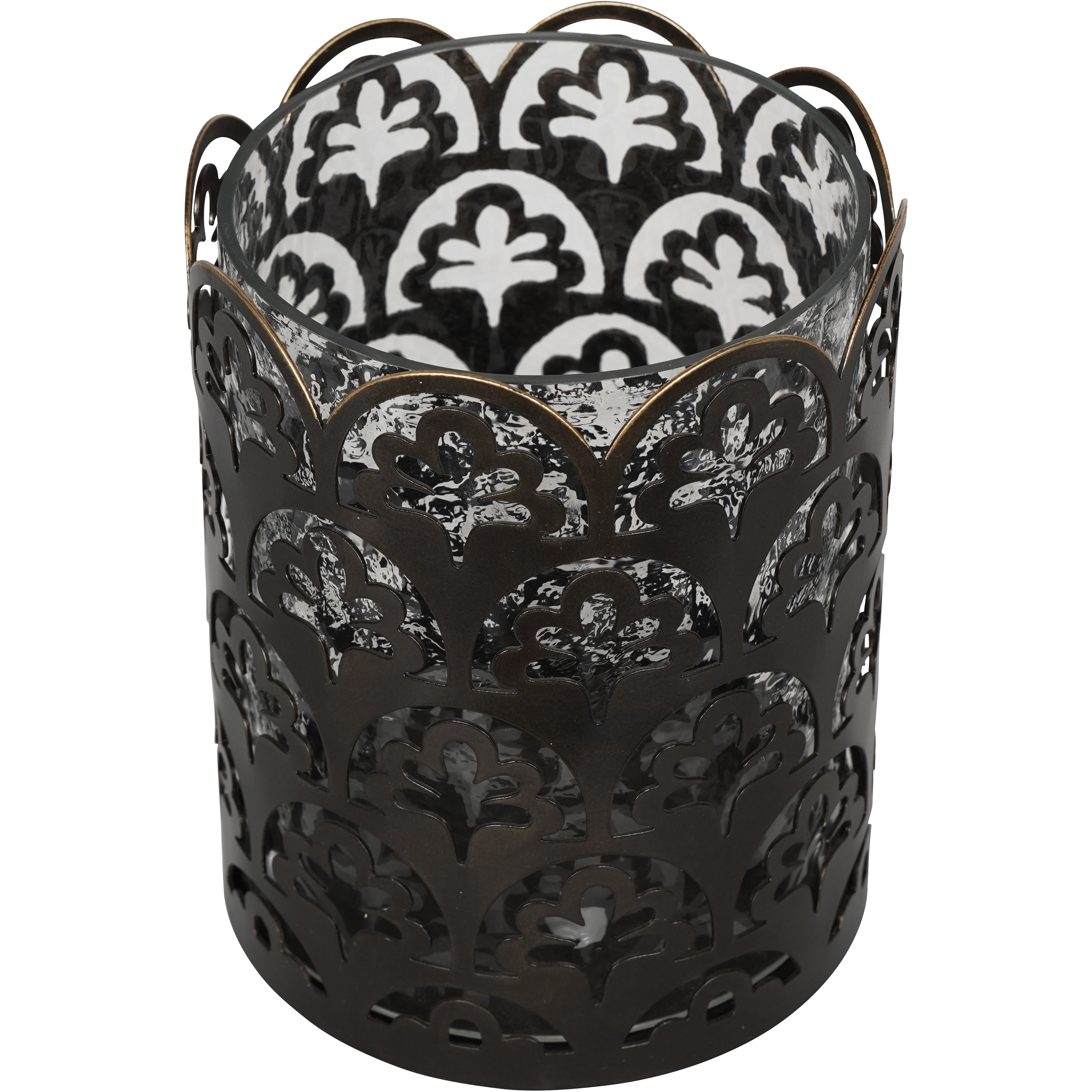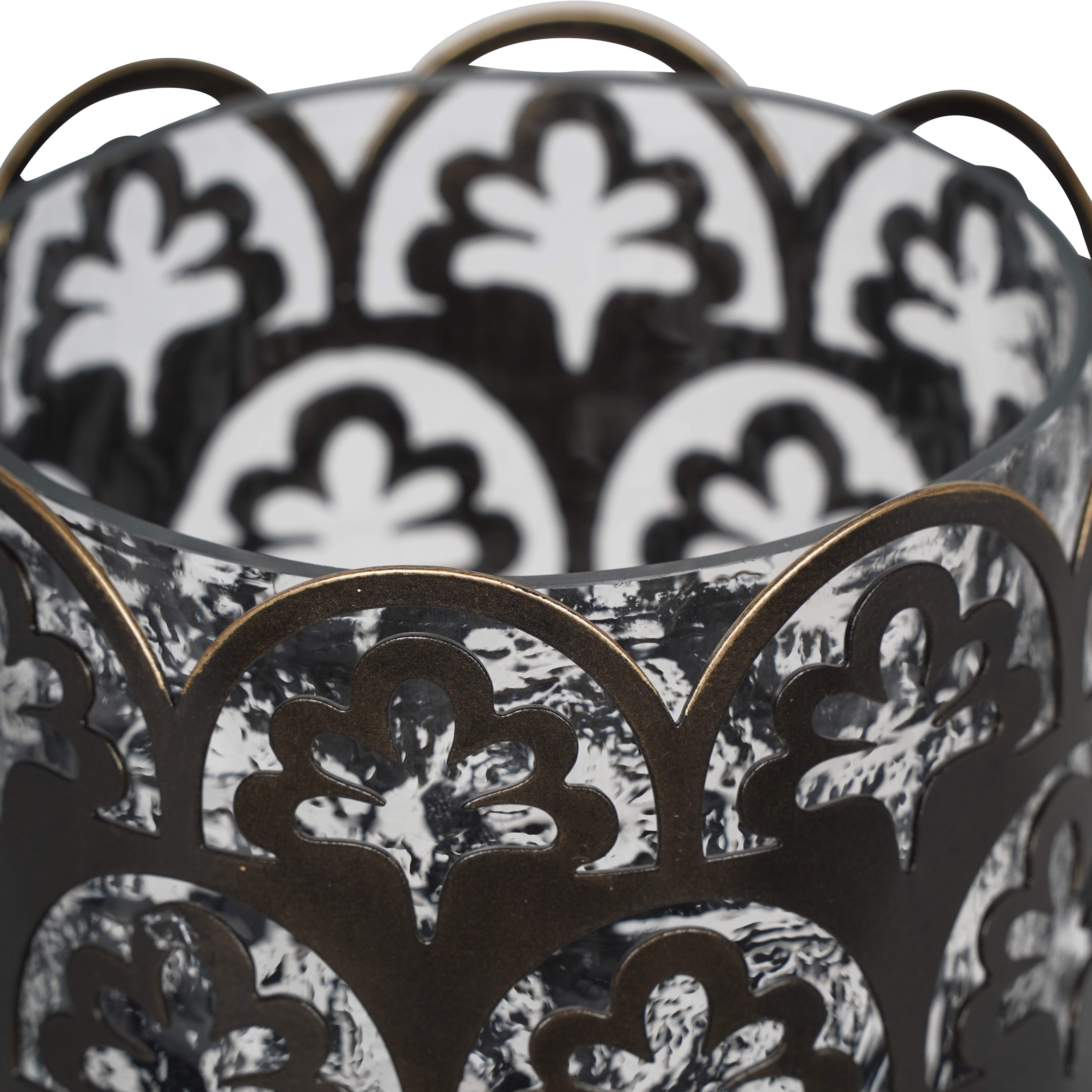 Elevate the ambiance of any room with the Laura Ashley Small Catarina Hurricane. Its clear hammered glass drum is paired with the intricate metalwork featuring the beloved Musica pattern by Laura Ashley. Finished in gilded bronze, this classic hurricane will add a touch of luxury to any space.
