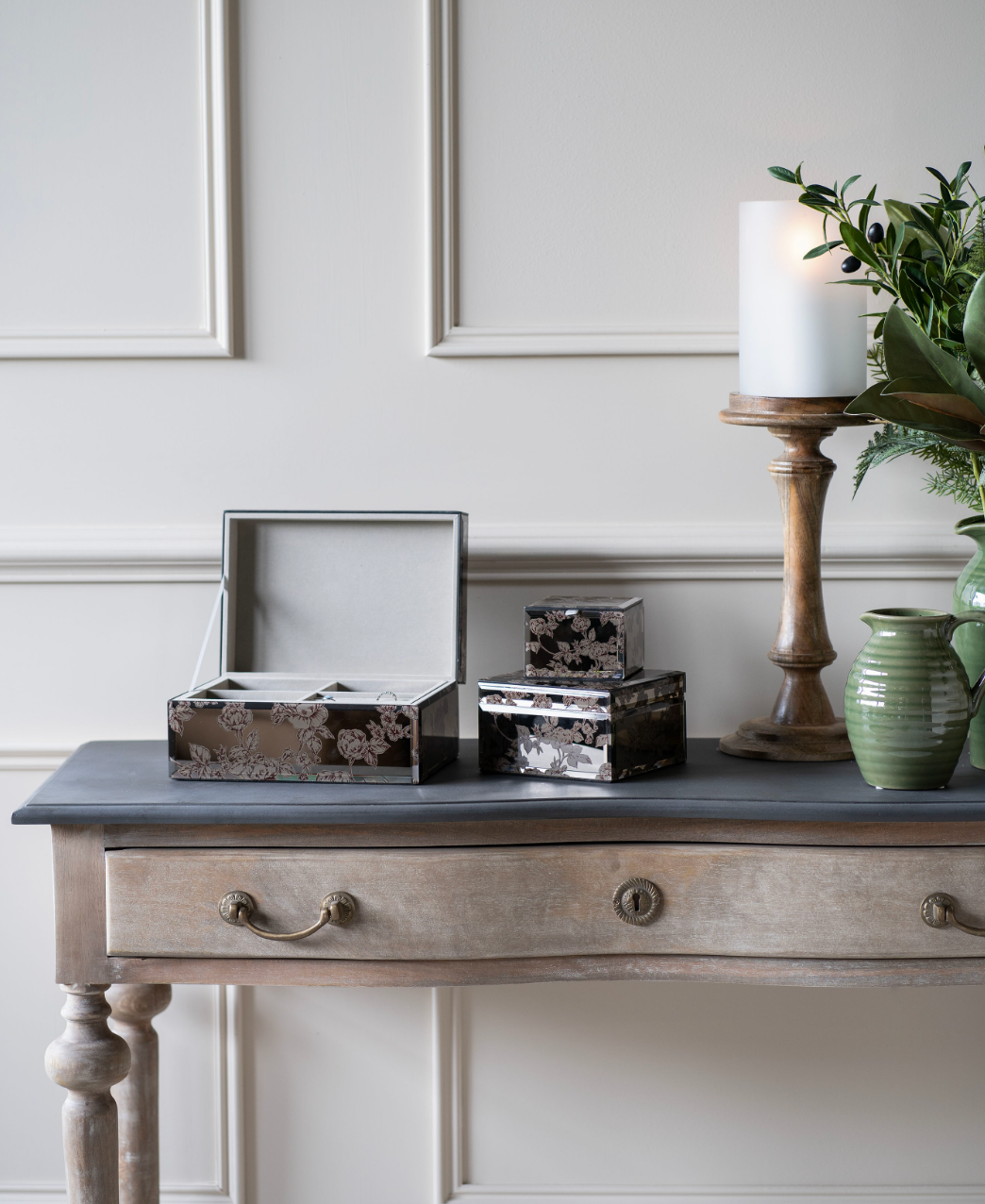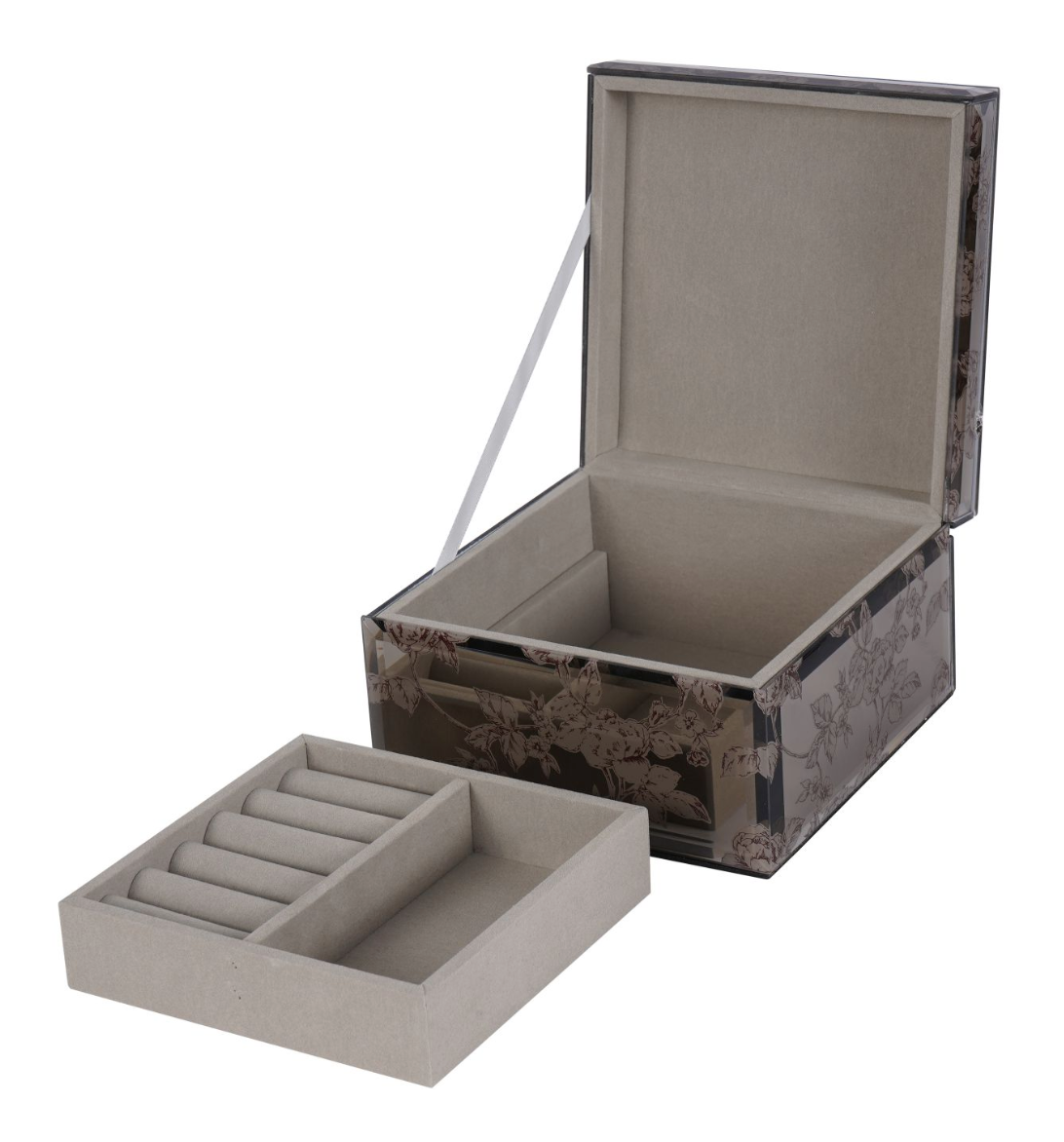 This medium mirrored jewellery box features a beautiful Laura Ashley Truffle Pollington Roses print. With its elegant design, it will add a touch of sophistication to any dressing table. The mirrored lid allows for easy viewing of your jewellery, while the compartments provide ample storage space.