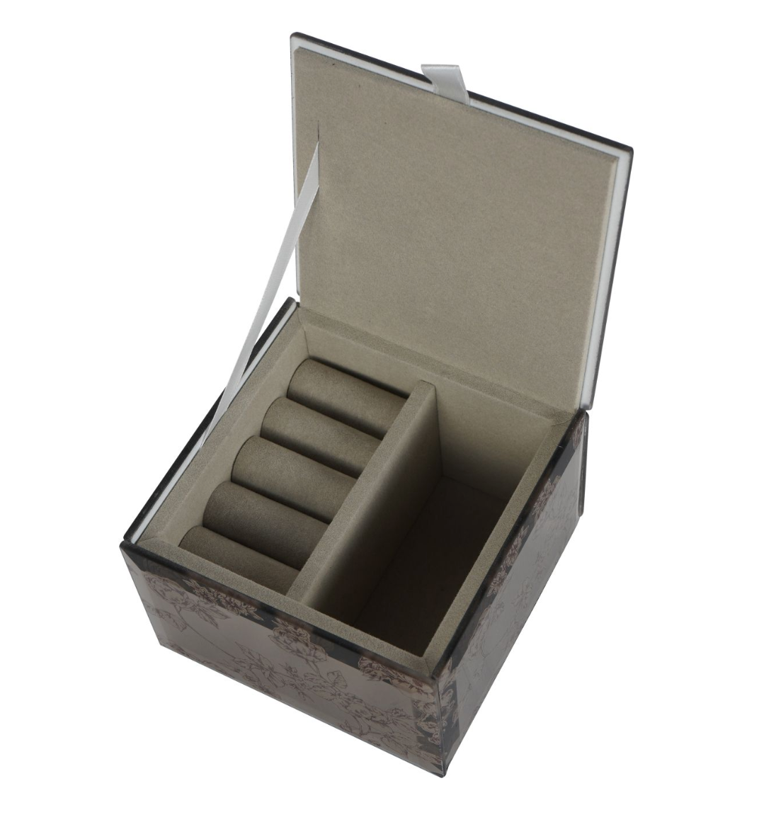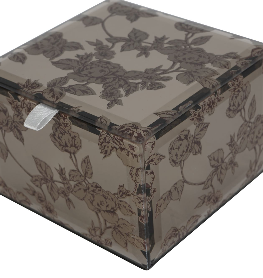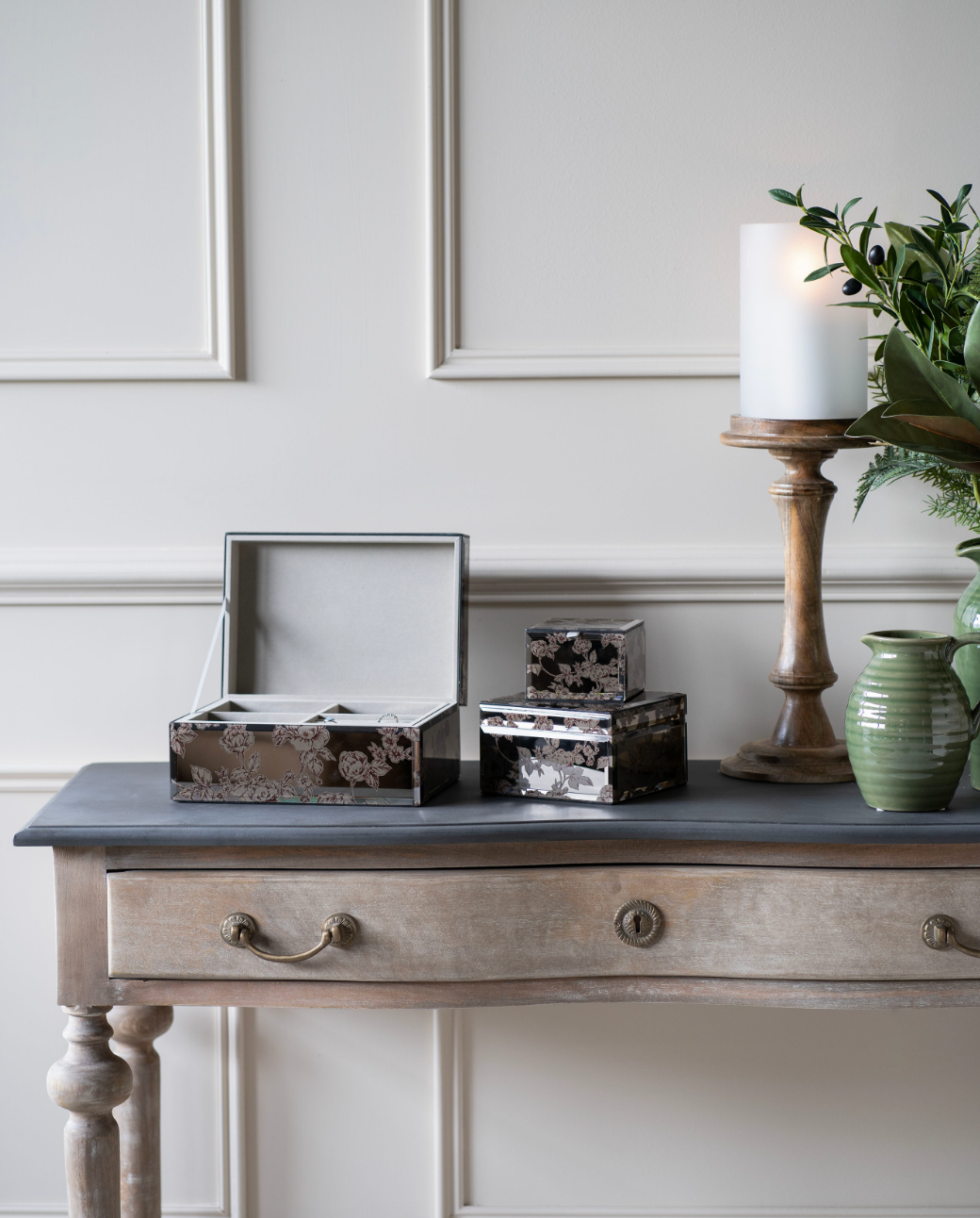This small mirrored jewellery box features a beautiful Laura Ashley Truffle Pollington Roses print. With its elegant design, it will add a touch of sophistication to any dressing table. The mirrored lid allows for easy viewing of your jewellery, while the compartments provide ample storage space.
