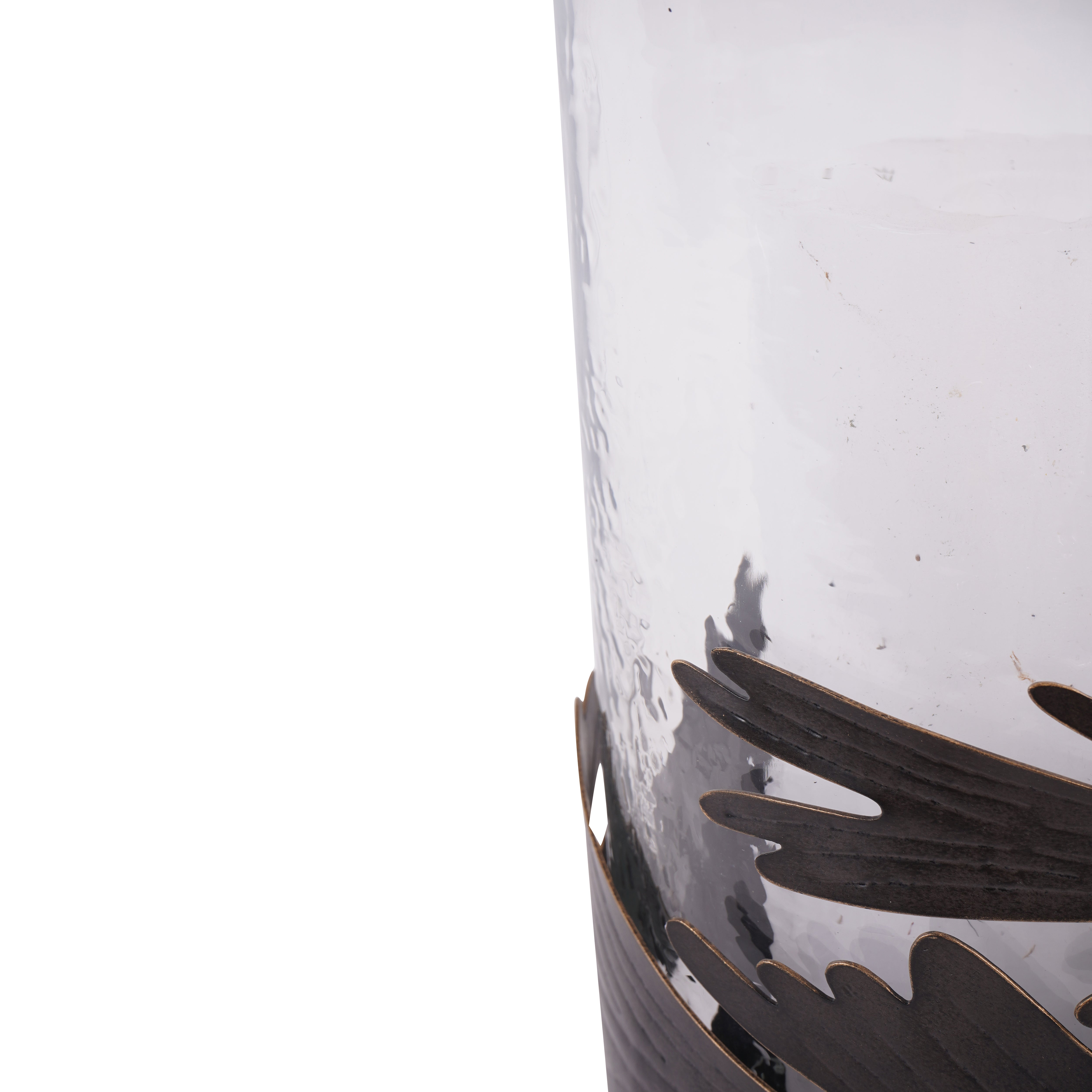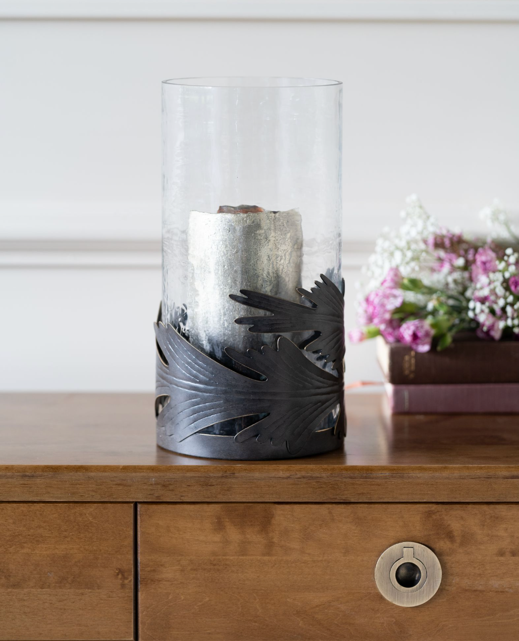 Transform your space with the elegant Laura Ashley Winspear Leaf Hurricanes. Featuring a clear hammered glass drum intertwined with delicate metal Winspear leaf in antique gold, these lanterns adds a touch of sophistication to any room. Illuminate your home with a warm and inviting glow, creating a peaceful and welcoming atmosphere.