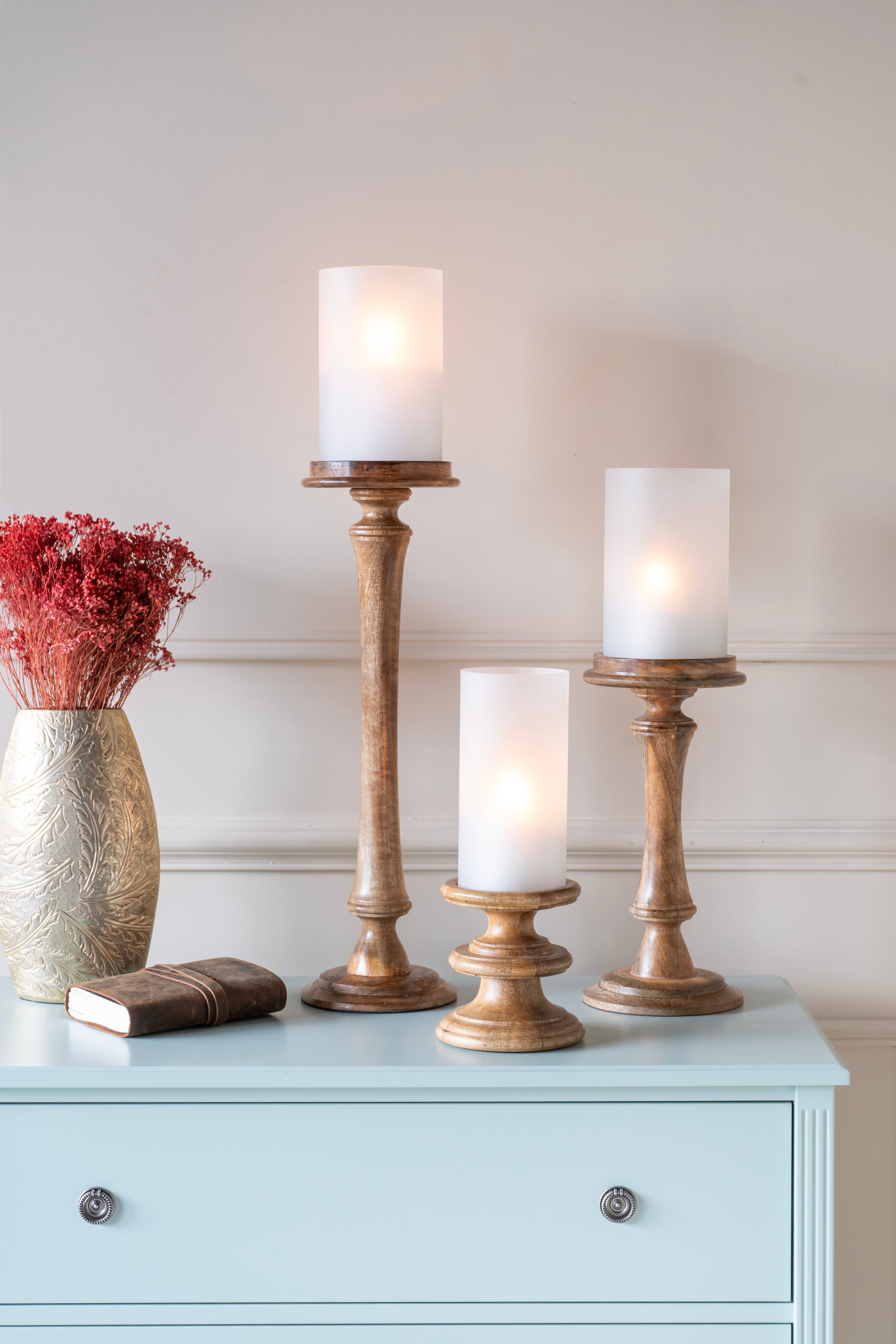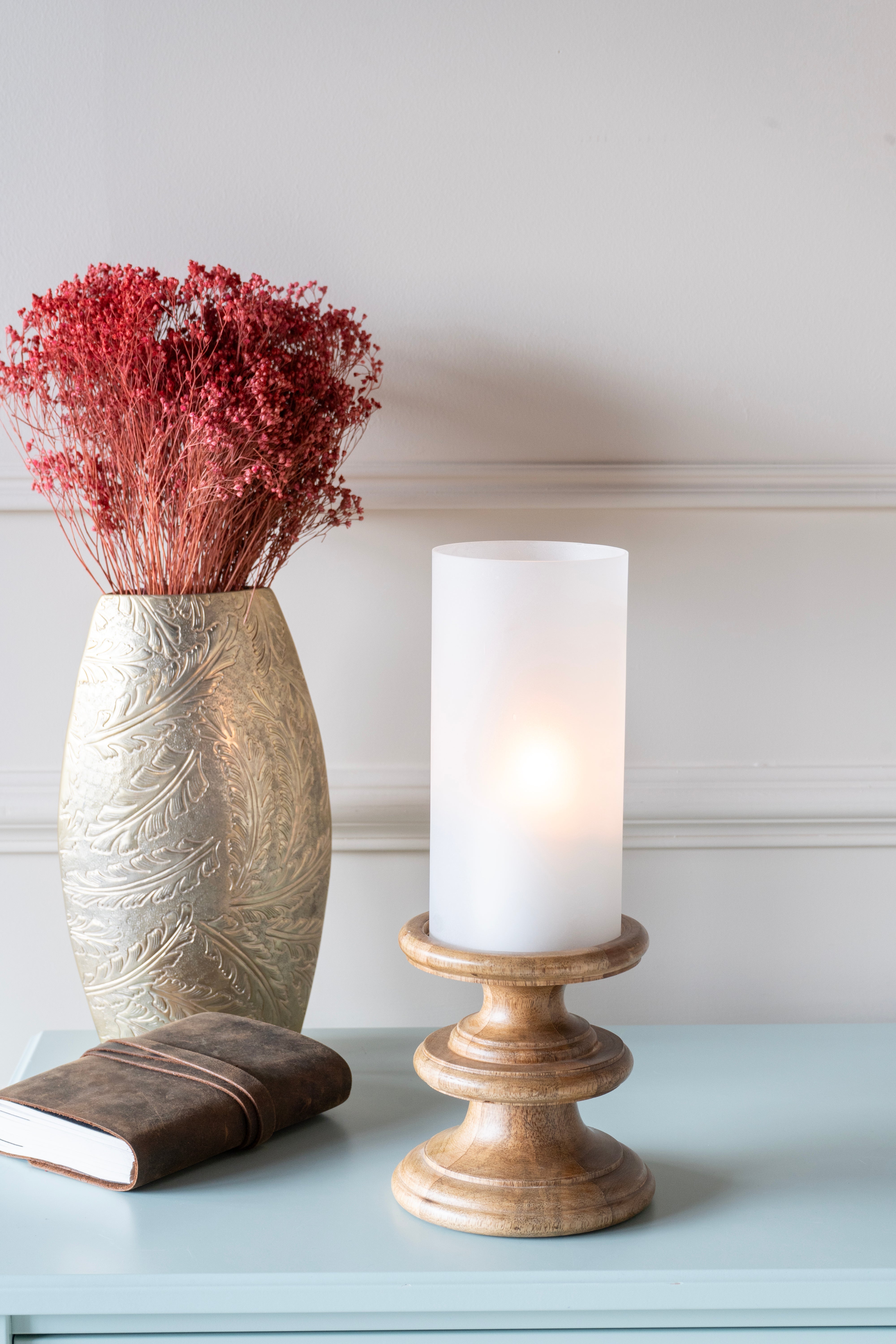 Elevate your home decor with the Laura Ashley Wooden Plinth Hurricane! The joyful frosted glass hurricane sits atop a beautiful turned wooden stand, offering a stunning contrast. A perfect addition to any collection, this piece adds warmth and charm to any room.