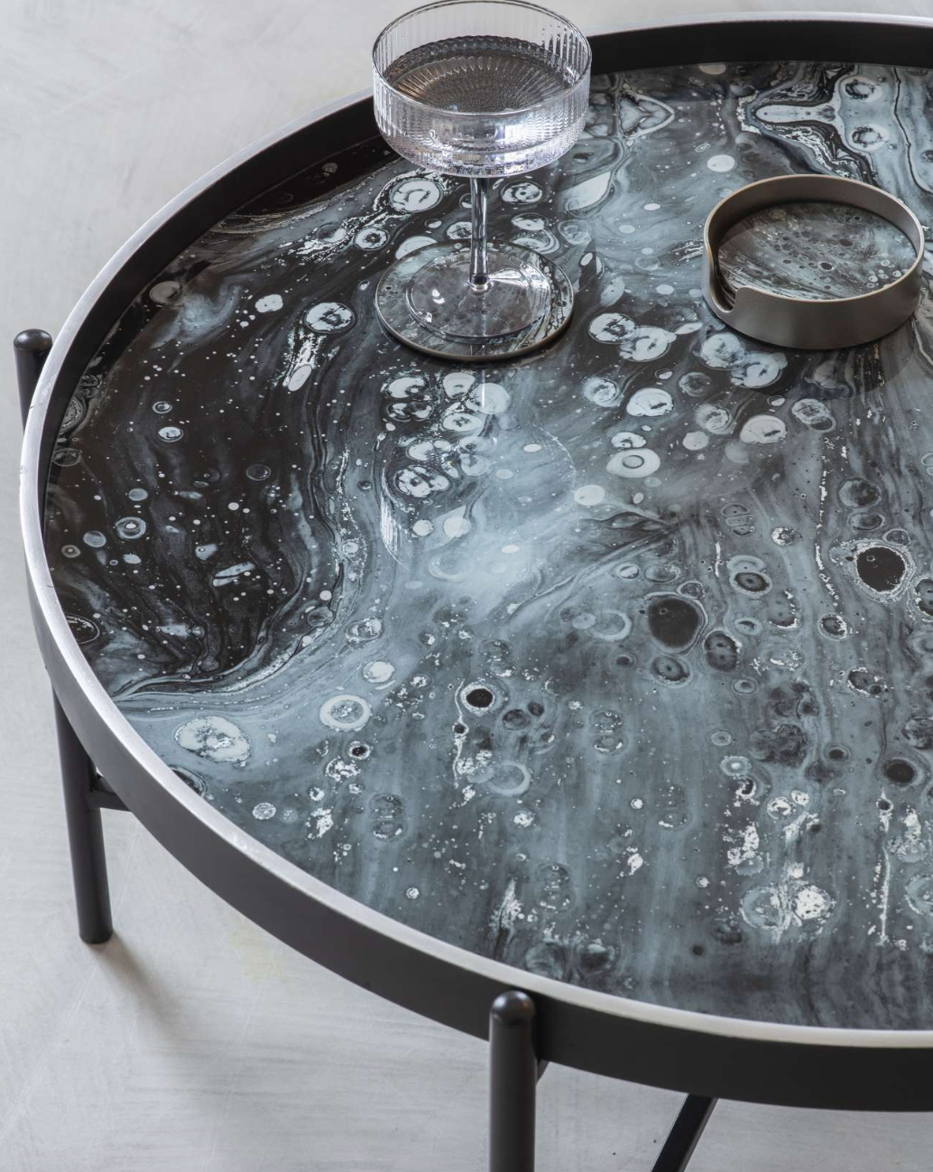 This elegant Monochrome Swirl coffee table, measuring 80cm in diameter, boasts a stunning molten swirl design and is complemented by a hand-painted silver rim. Perfect for storage, the tray is removable and the base folds for easy storage. Complete your collection with matching side tables and coasters.