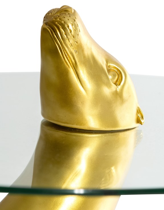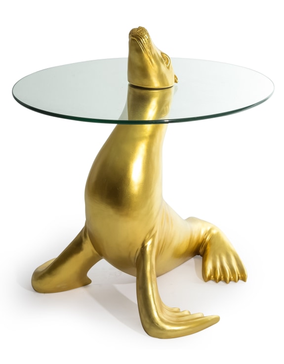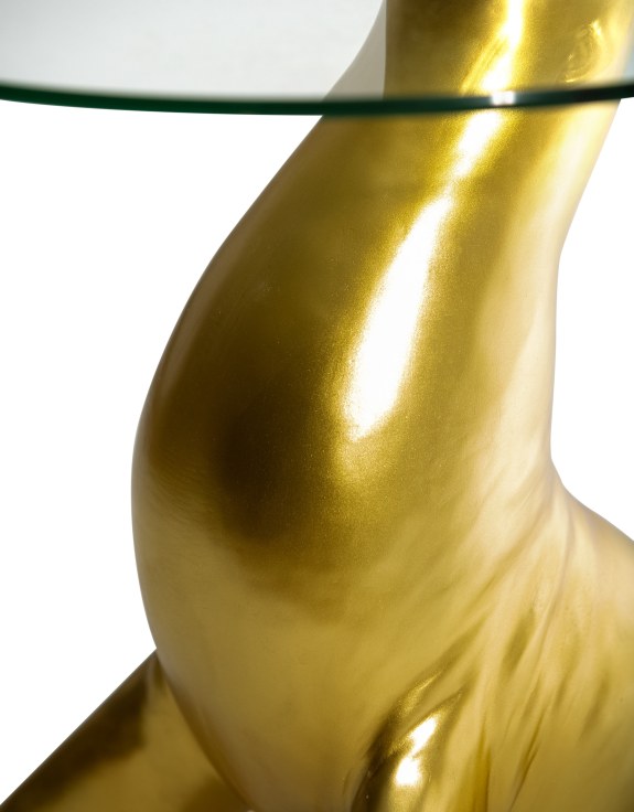 Introducing the Antique Gold Seal Coffee/ Side Table - the perfect addition to any living space! This unique piece features a circular glass top held up by a sturdy seal-shaped base. Enjoy a touch of whimsy and practicality with this one-of-a-kind coffee/ side table.