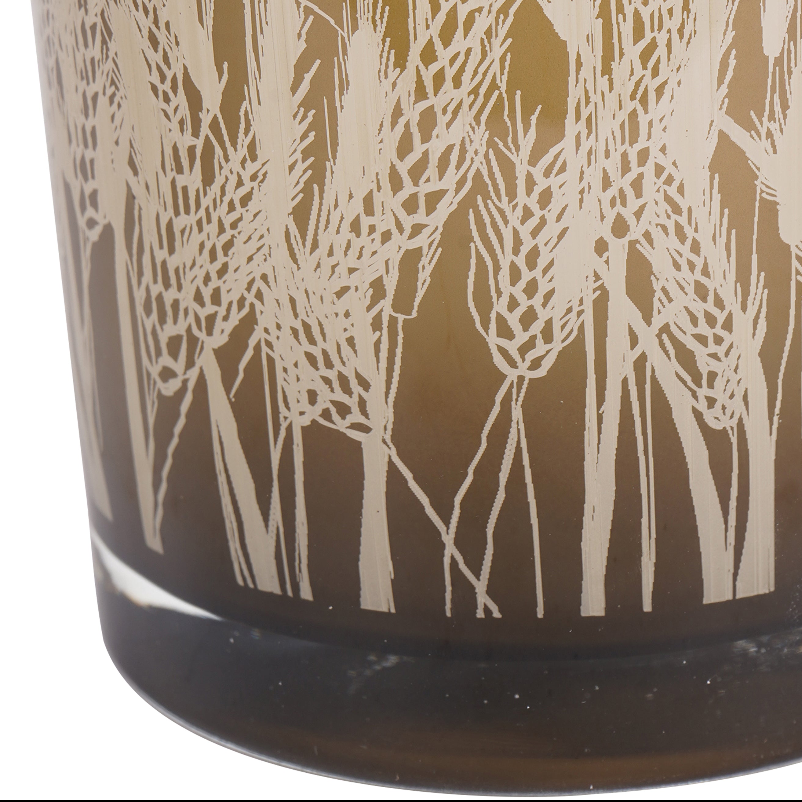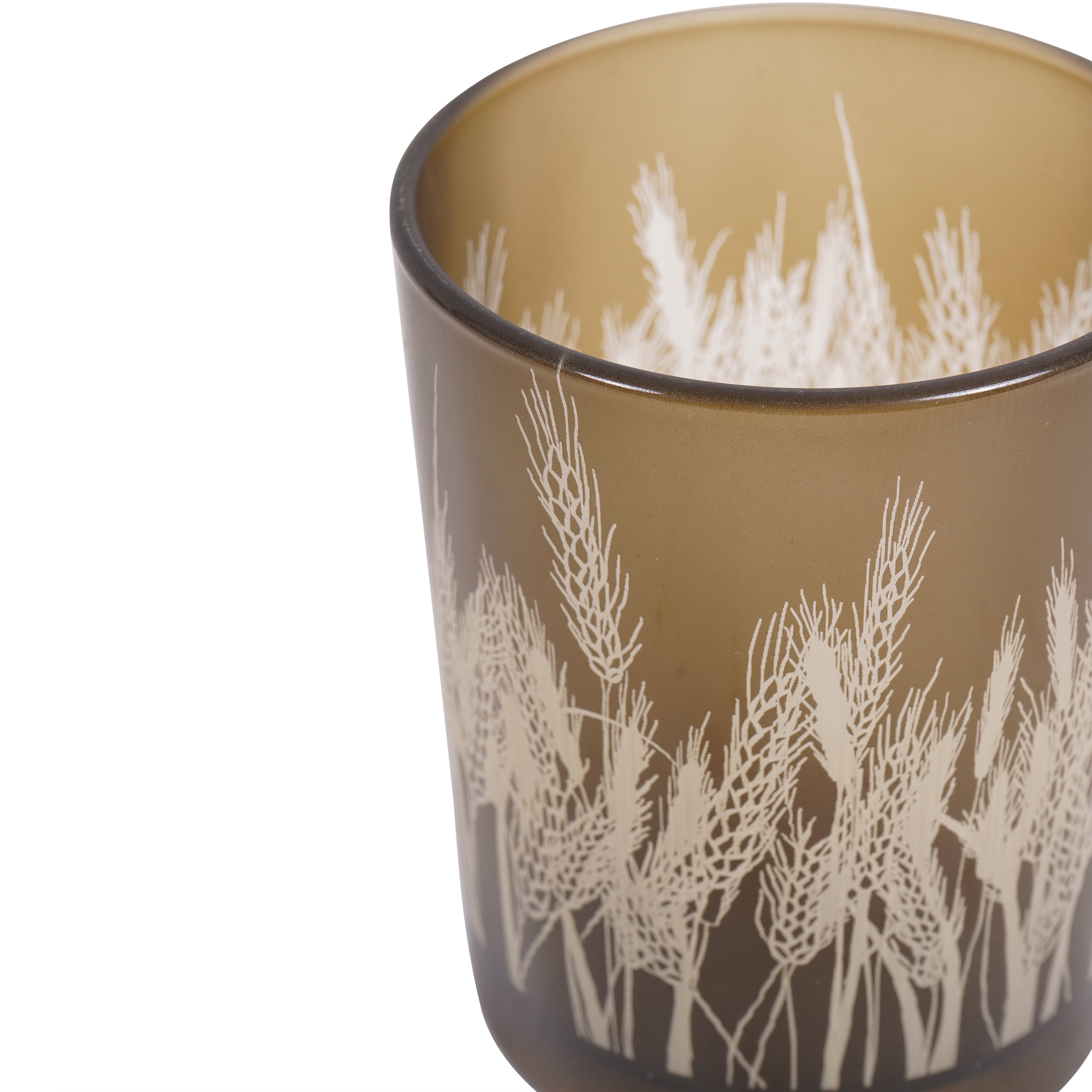 Enhance the ambiance of any room with Norfolk's Wheatfields Small Glass Candle Holder. The beautifully etched wheat design adds warmth and elegance, while the rich brown hue complements any decor. Available in two sizes, it's perfect for use with a 4-inch pillar candle or as a standalone decorative piece. Expertly crafted for a captivating addition to your space.