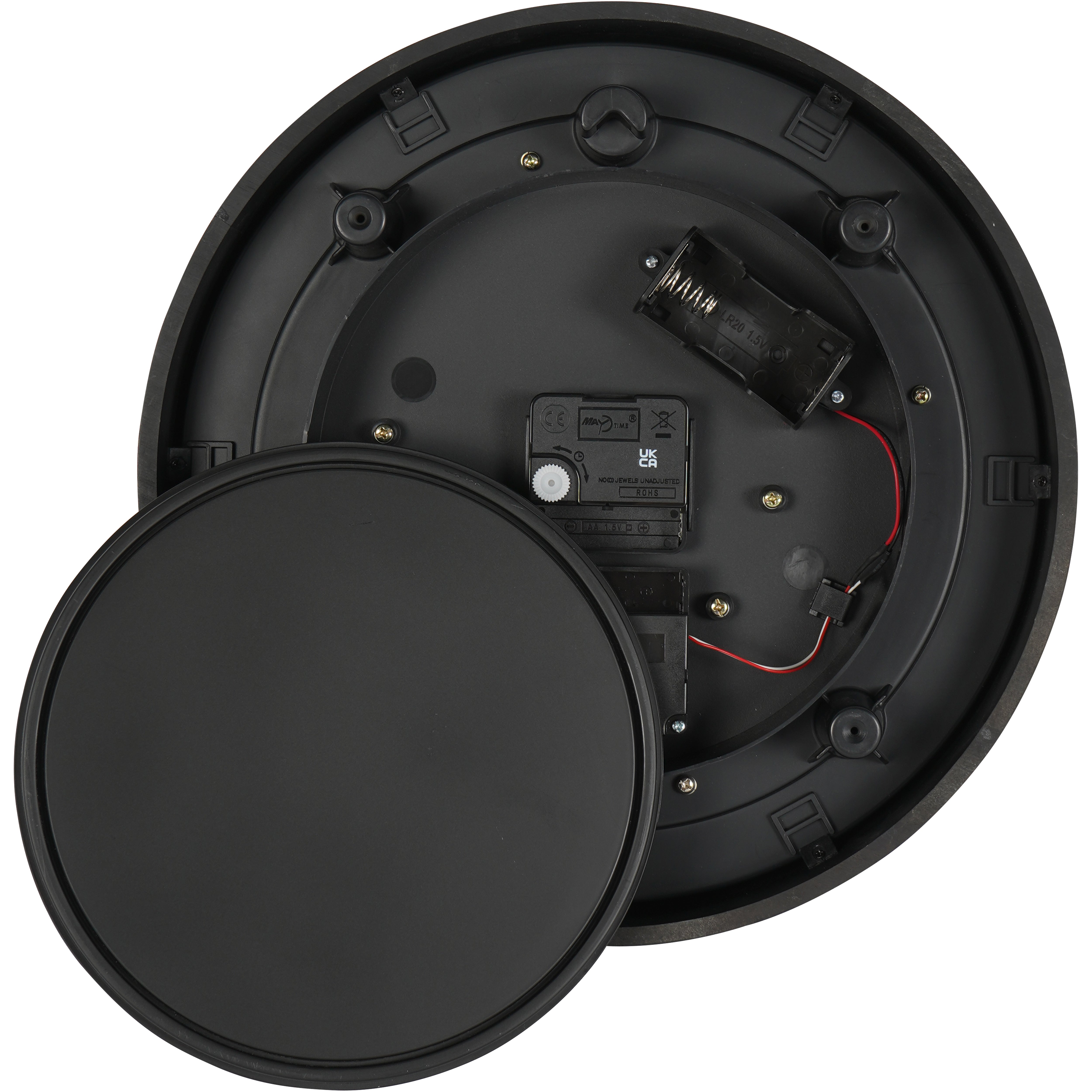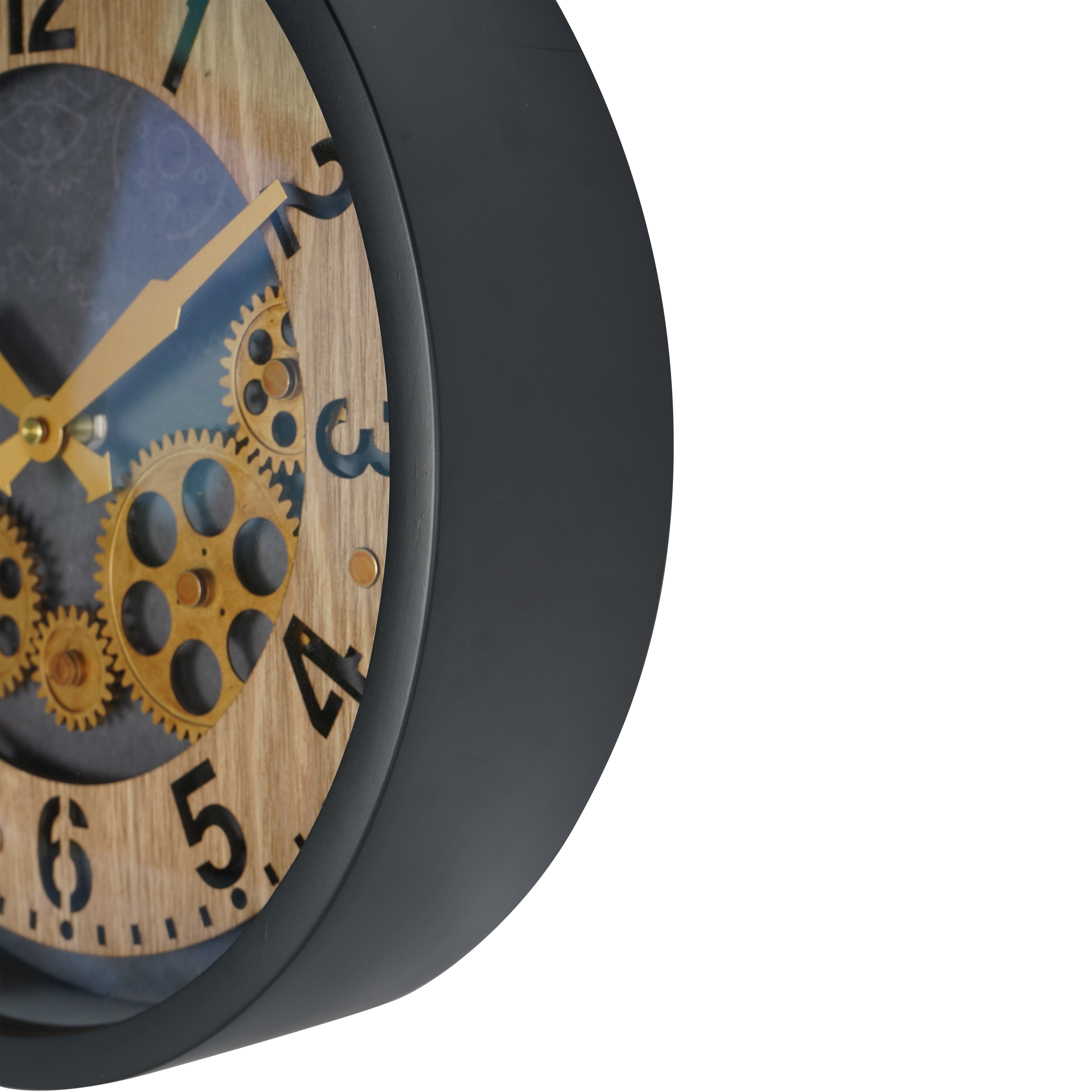 Enhance your space with our Palladium Mini Dials Clock in Black. Featuring a painted black frame and intricate wooden dial cutouts, this clock exudes sophistication and innovation. The bold gold hands and moving brass cogs add visual appeal, while the gentle ticking sound adds a touch of nostalgia. Battery not included. Requires 1 AA battery for the clock and 1 x LR20 battery for the gears