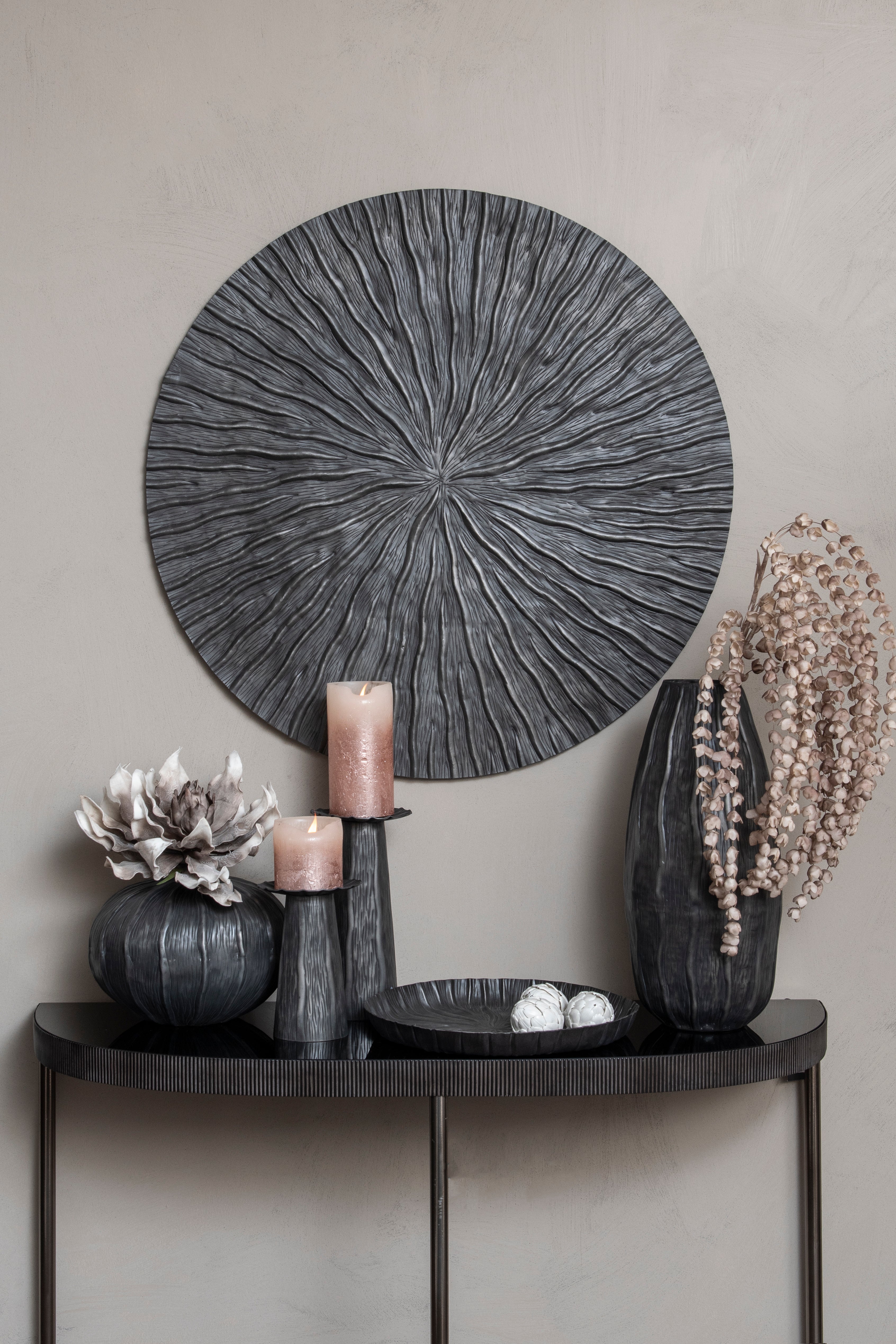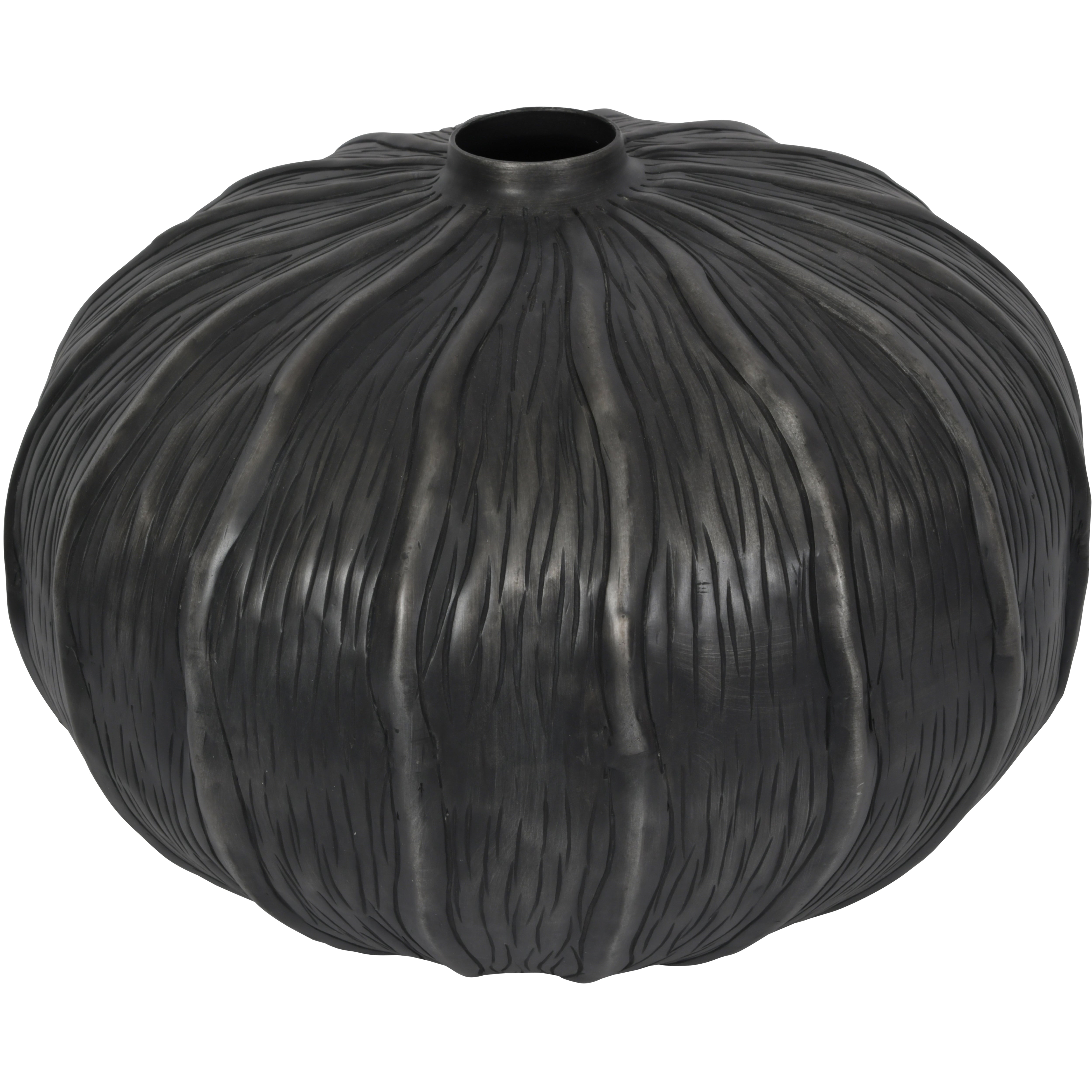 Experience the timeless elegance of our Persephone Squat Vase. Handcrafted in aluminium, and crafted by hand using traditional methods, this vase features organic ripple details and a stunning matte black finish with brushed nickel tones. Perfect for displaying decorative florals or as a statement piece. Not water safe.