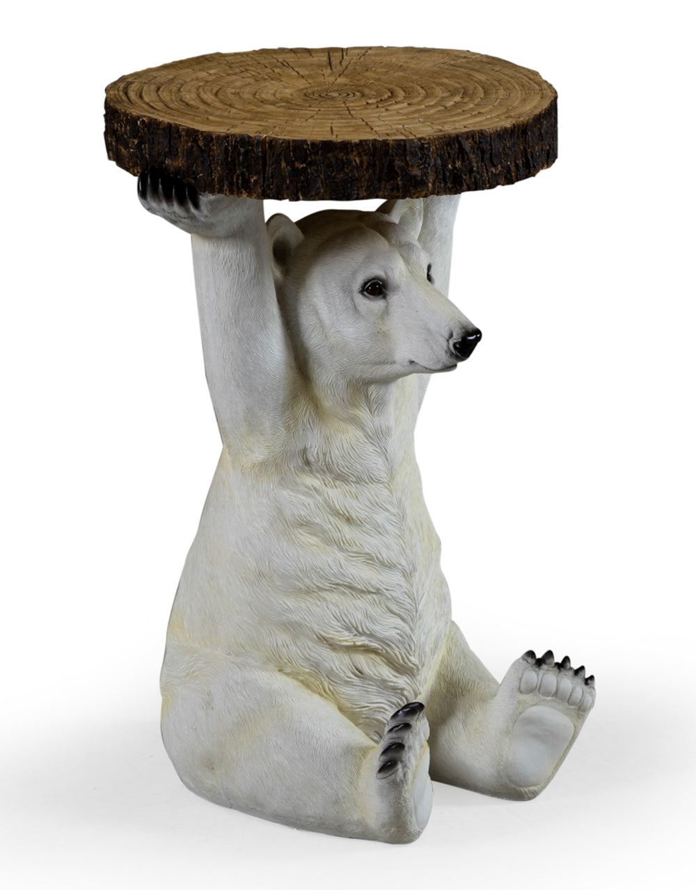 Add a touch of playful charm to your living space with our Polar Bear Holding "Trunk Slice" Side Table. This unique piece features a Polar Bear holding a natural trunk slice, making it a functional and whimsical addition to any room. Bring a sense of joy and delight into your home with this one-of-a-kind side table!