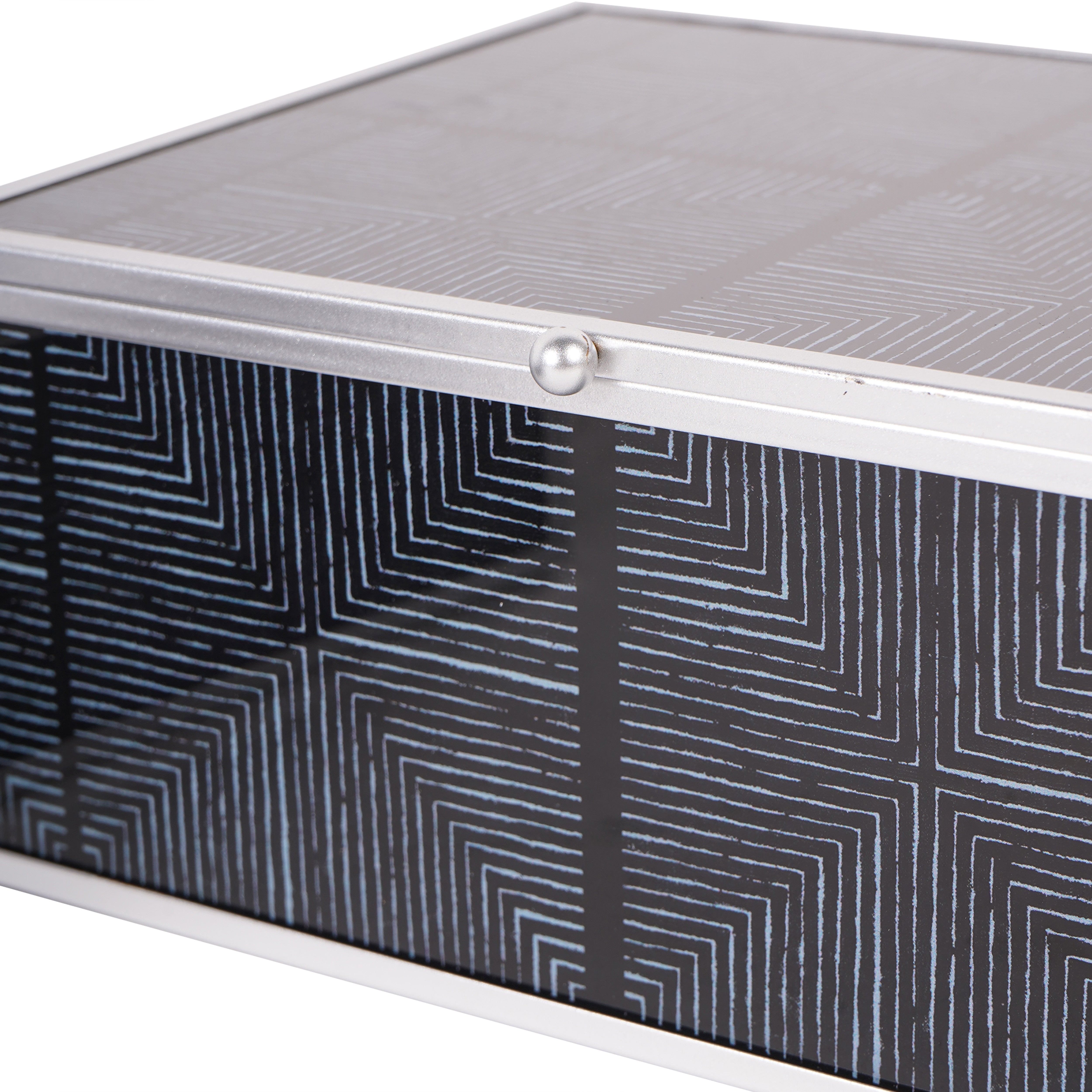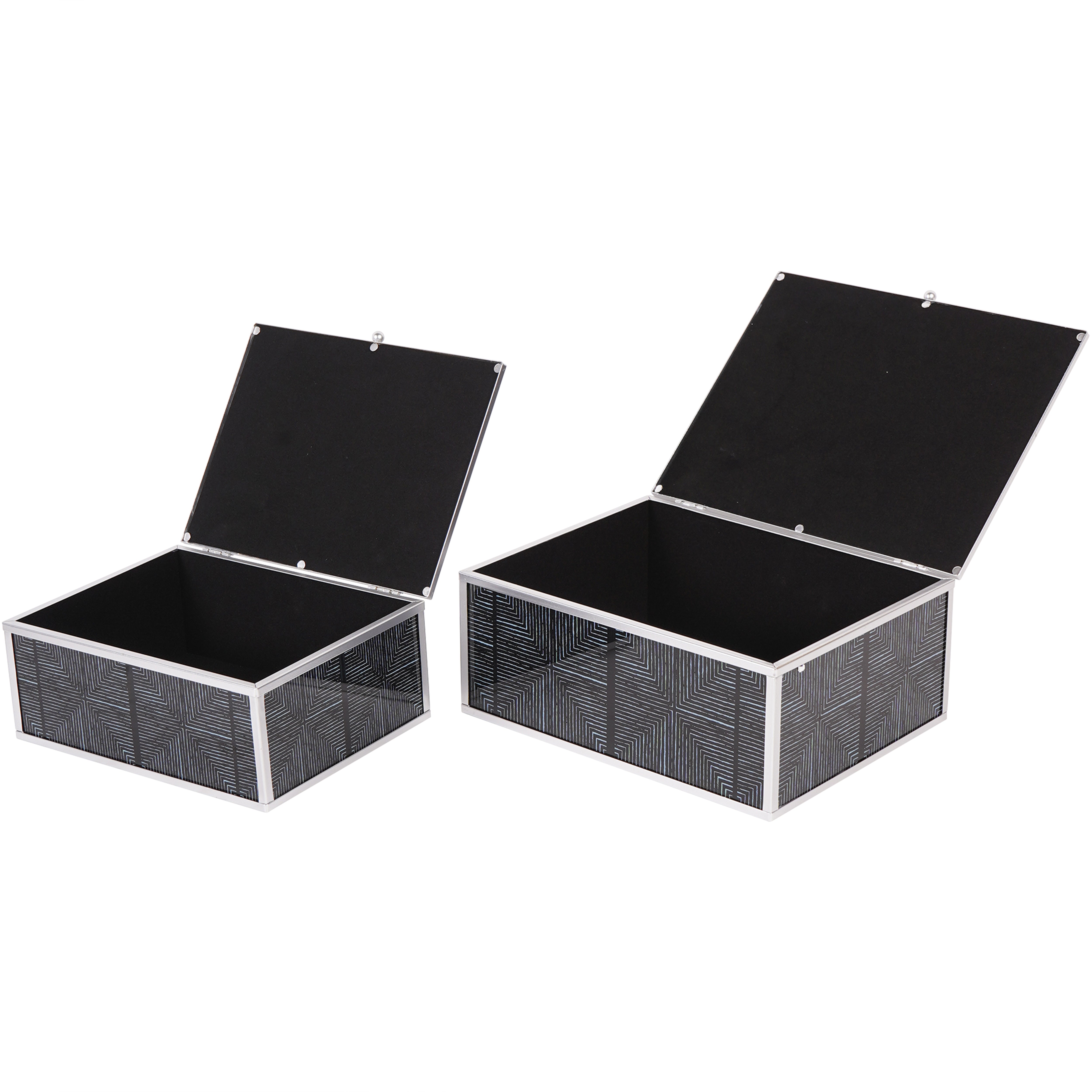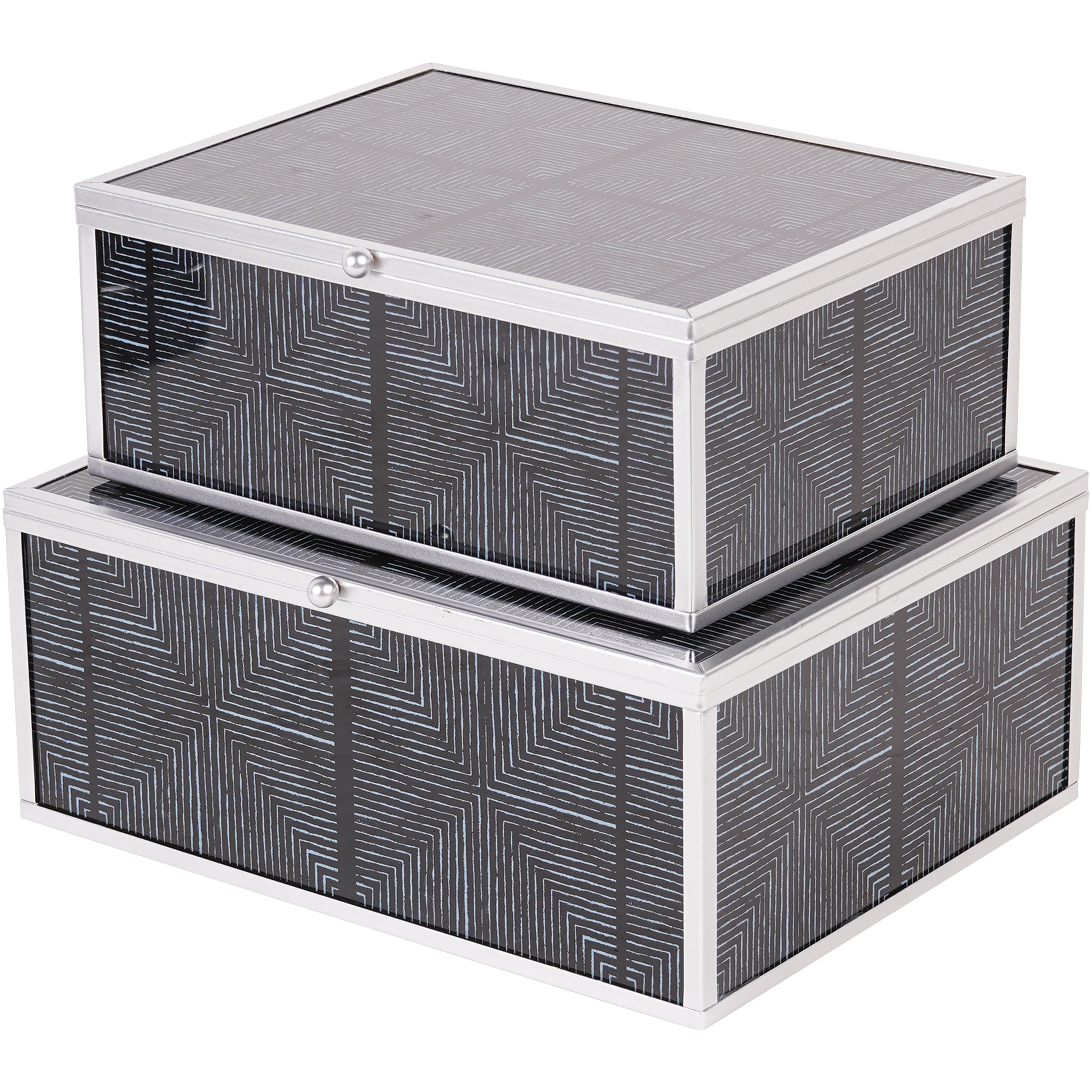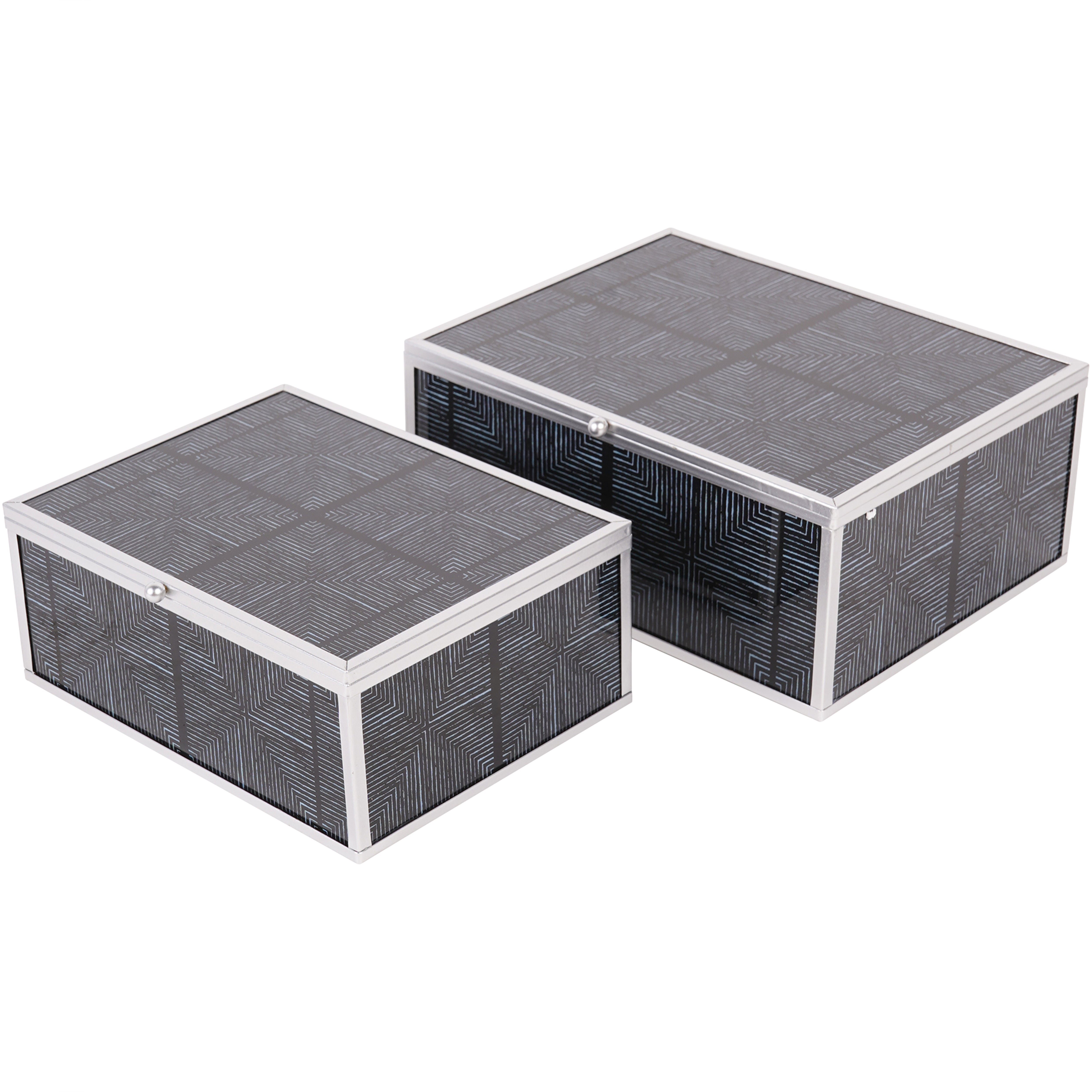 Add a touch of modern sophistication to your home decor with our Set of 2 Black Squares Pattern Boxes. The striking silver design on a black base exudes balance and symmetry, making it perfect for both interior decoration and graphic design. Available in matching coasters and trays.