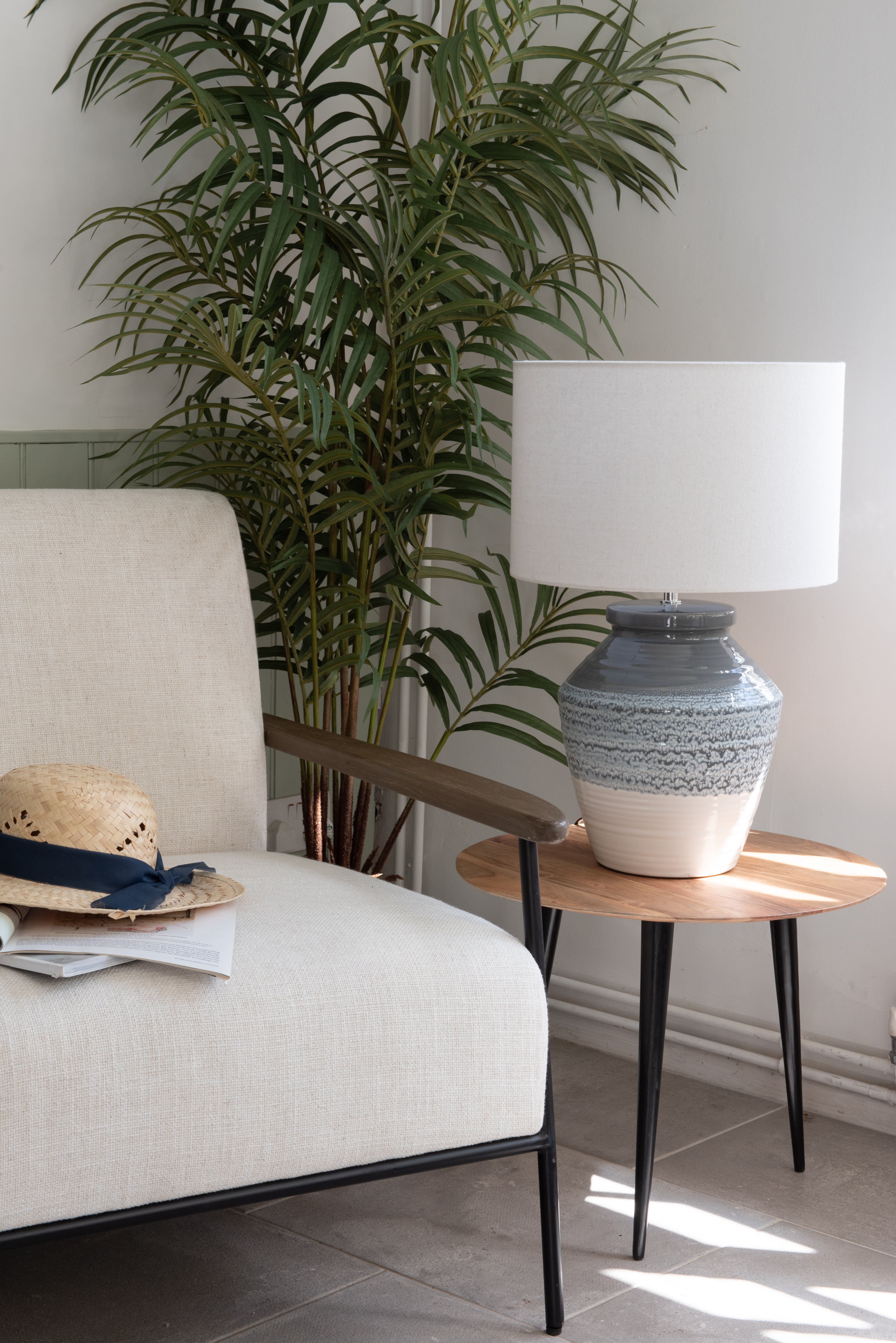 Introducing the Sienna Grey and Blue Ceramic Table Lamp, a sleek and sophisticated addition to any room. Crafted with a porcelain base and a unique two-tone glaze, this lamp effortlessly blends into any interior style. The soft tonal transition of the glazes creates a beautiful and calming effect, perfectly complemented by the crisp white linen shade. Elevate your space with this contemporary piece.