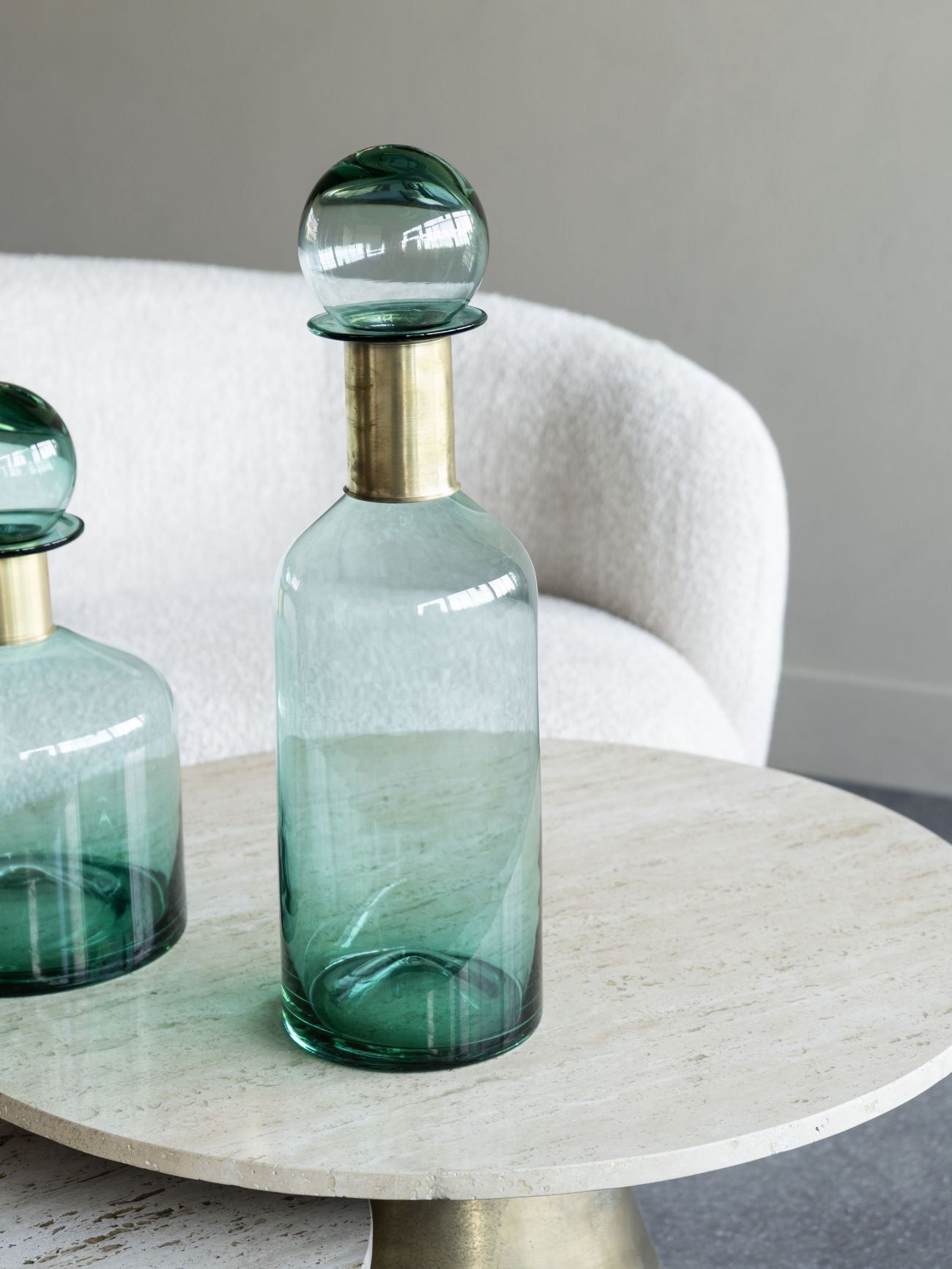 Indulge in the exquisite charm of our Tall Teal Glass Apothecary Bottle with Brass Neck. The sleek design of this bottle, crafted from luxurious teal glass and adorned with a brass neck, will add a touch of elegance to any space.