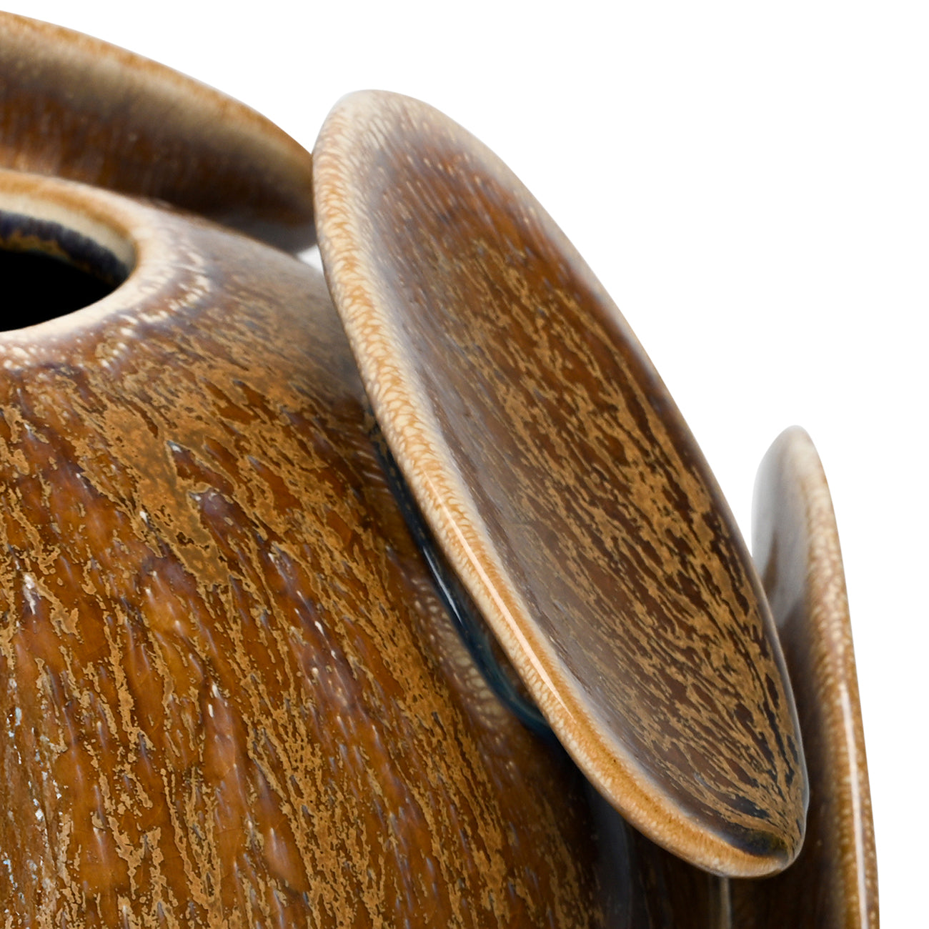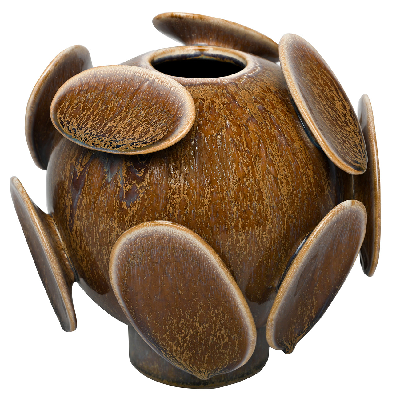 Striking and sculptural, the Wild Reactive Glaze Round Vase commands attention with its distinctive orb-like form and textured surface. Resting on a slender base, this statement piece showcases a glossy reactive glaze in warm brown tones that shift and deepen across its curves, creating rich visual interest. Oversized raised discs punctuate the rounded silhouette, casting subtle shadows that bring movement and dimension to any room. Display it solo for dramatic impact or pair with the matching planter to craft a cohesive, layered arrangement. Perfect for those seeking sculptural décor that elevates their interior aesthetic. Not water safe.