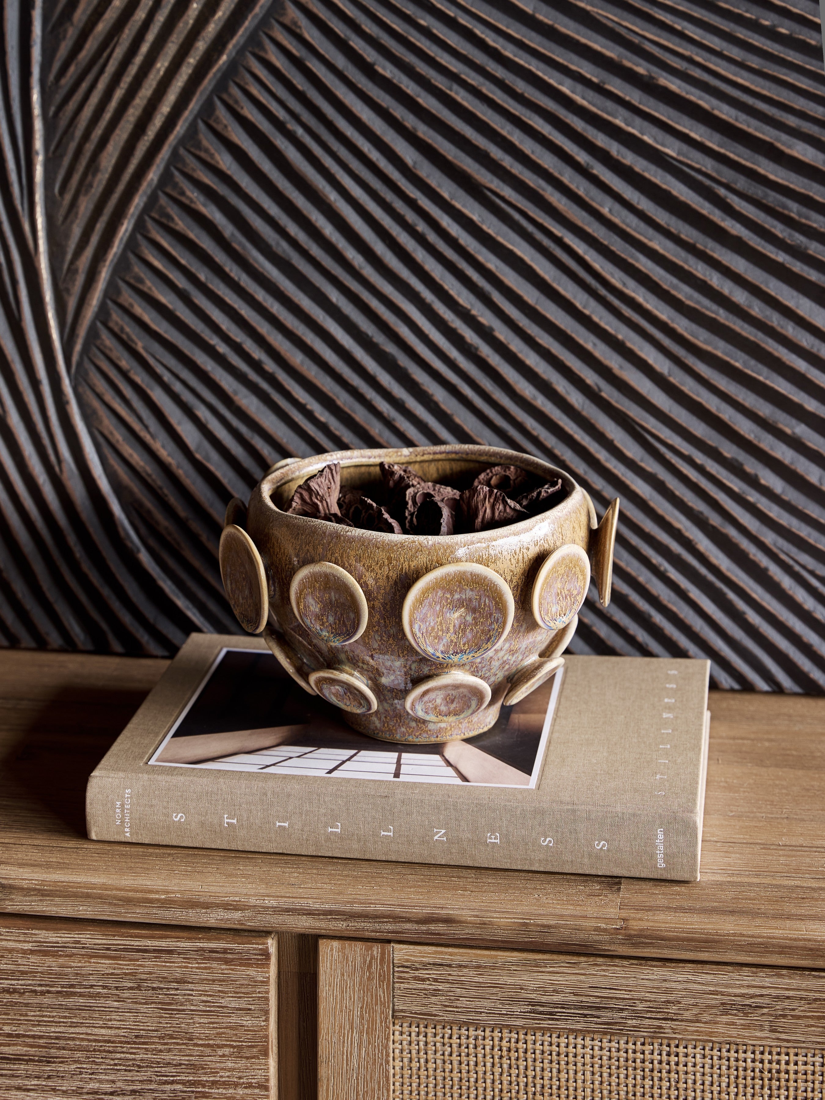 Elevate your greenery display with the Wild Reactive Glaze Stoneware Planter, a tactile masterpiece that merges artisanal craftsmanship with contemporary design. Hand-applied raised circular motifs dance across its surface, each catching light to reveal the depth of its reactive brown glaze—a finish that shifts and evolves with warmth and tonal richness. The generous rounded silhouette provides ample space for statement plants whilst its sculptural presence transforms any corner into a curated focal point. Whether showcased independently or paired with the matching vase, this planter infuses interiors with earthy sophistication and organic character that speaks to discerning design lovers.